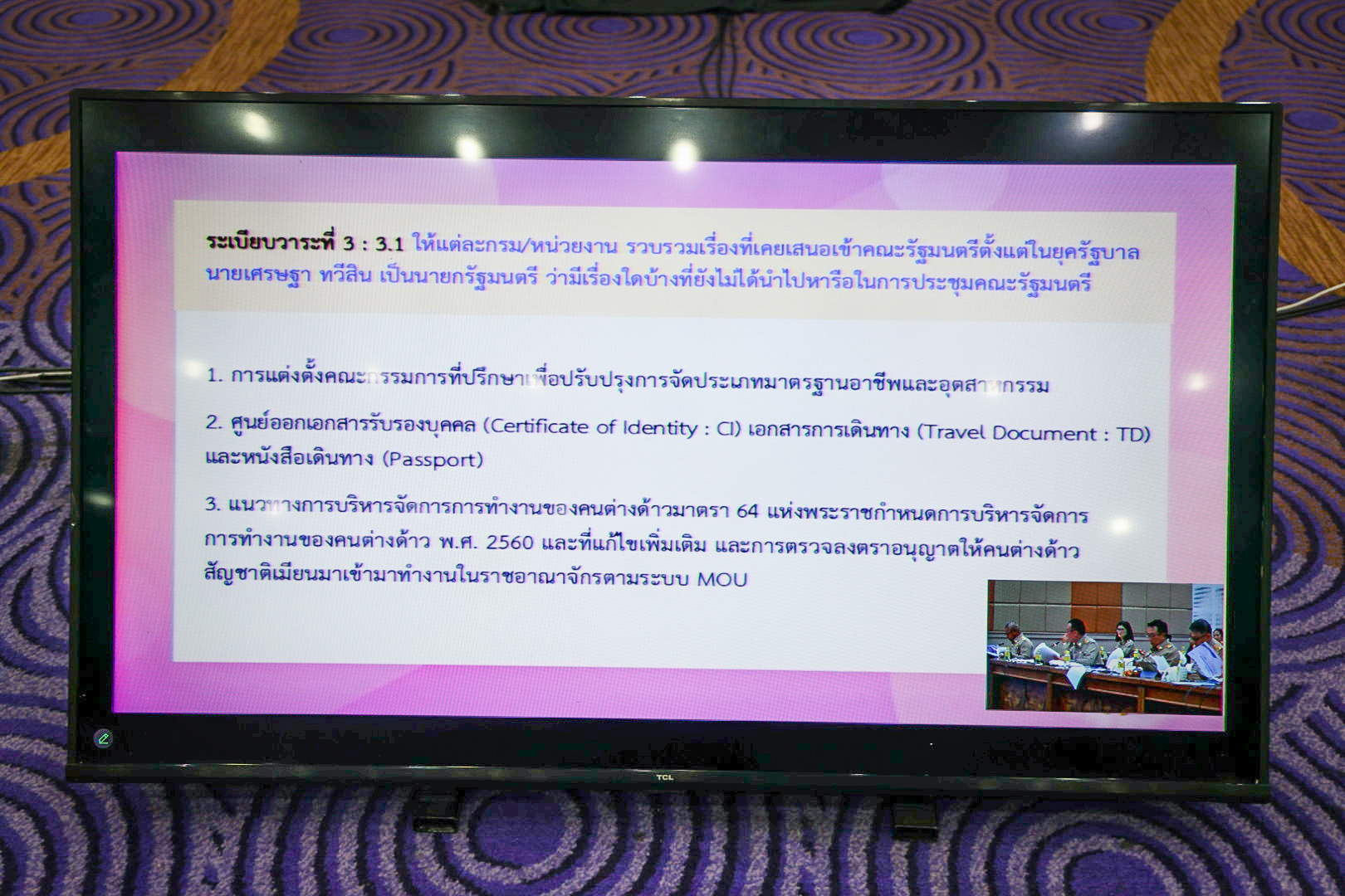 ทั้งนี้ ที่ประชุมได้รับทราบรายงานผลการดำเนินงานตามข้อสั่งการของรัฐมนตรีว่าการกระทรวงแรงงาน โดยรัฐมนตรีว่าการกระทรวงแรงงาน ได้รับทราบผลการดำเนินงานของแต่ละหน่วยงานสังกัดกระทรวงแรงงาน และได้เน้นย้ำให้ 5 เสือแรงงาน ช่วยกันเป็นหูเป็นตาสนับสนุนข้อมูลในการตรวจสอบการทำงานของแรงงานต่างด้าวที่เข้ามาทำงานในประเทศไทยของกรมการจัดหางานและชุดเฉพาะกิจไตรเทพพิทักษ์ของกระทรวงแรงงาน เพื่อให้แรงงานต่างด้าวทำงานอย่างถูกต้องตามกฎหมายมากที่สุด โดยระหว่างการประชุมรัฐมนตรีว่าการกระทรวงแรงงาน ได้วิดีโอคอลกับ 5 แรงงานไทยที่ได้รับการปล่อยตัวในอิสราเอลไปยัง รพ. Shamir Medical Center ประเทศอิสราเอล ซึ่งเป็นสถานที่ที่แรงงานไทยพักรักษาตัวอยู่หลังการได้รับการปล่อยตัว โดยได้กล่าวแสดงความยินดีและขอต้อนรับแรงงานไทยทั้ง 5 คน ที่ได้รับการปล่อยตัวกลับสู่อ้อมกอดของประเทศไทย กลับสู่อ้อมกอดของครอบครัวที่แสนอบอุ่นของพ่อแม่ ญาติพี่น้องครอบครัว และลูกๆ ทั้งนี้ ยืนยันว่าทันทีที่ทราบวันเวลากลับประเทศไทยที่ชัดเจน ผู้บริหารกระทรวงแรงงานจะไปรับที่สนามบินสุวรรณภูมิ รวมทั้งเน้นย้ำว่าหากมีอะไรที่จะให้กระทรวงแรงงานดูแลรับใช้ได้ก็ขอให้แจ้งมาอย่าได้เกรงใจ และกำชับให้เอกอัครราชทูตที่ปรึกษาฝ่ายแรงงาน ณ กรุงเทลอาวีฟ ดูแลแรงงานทั้ง 5 คนให้ดีที่สุด