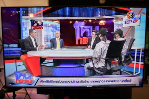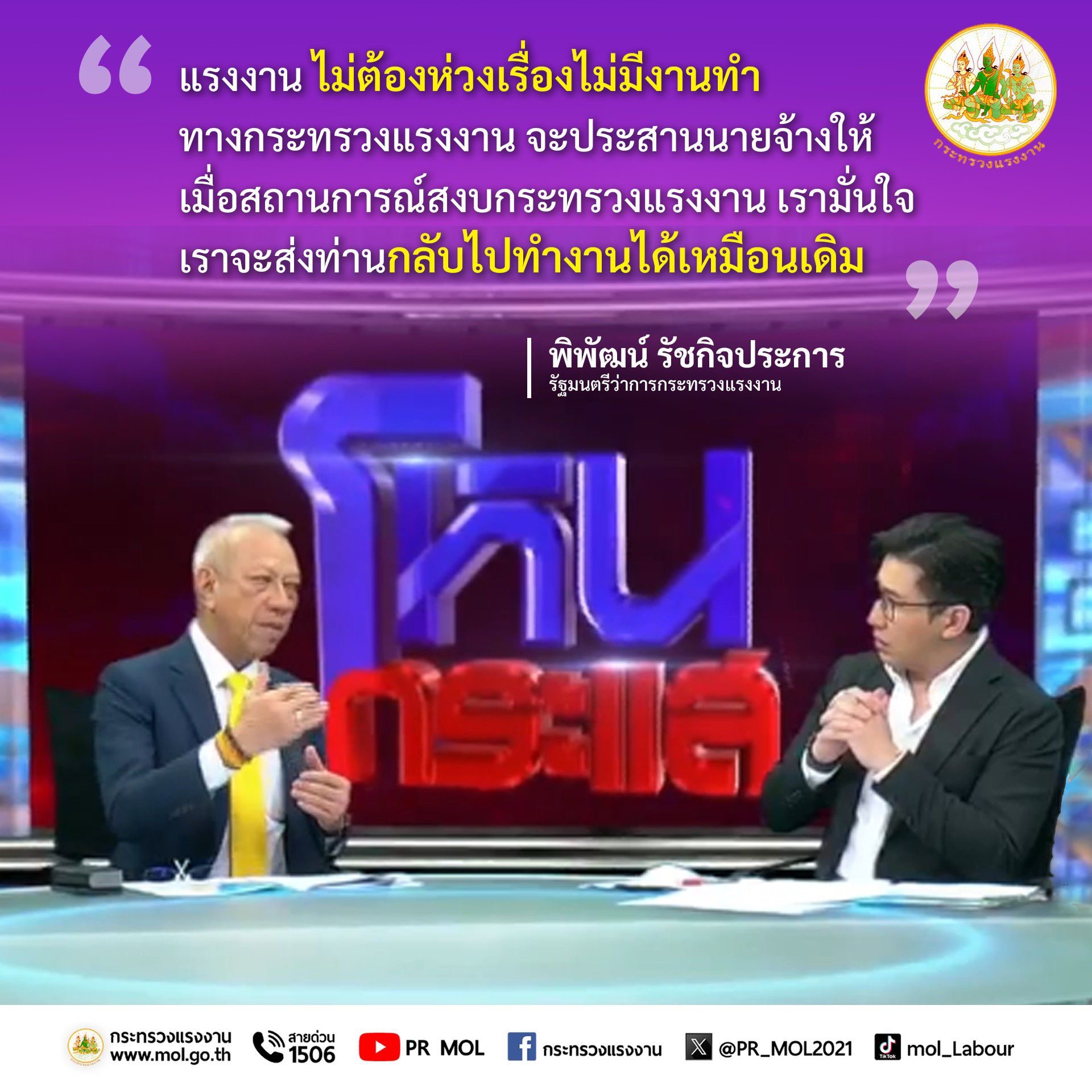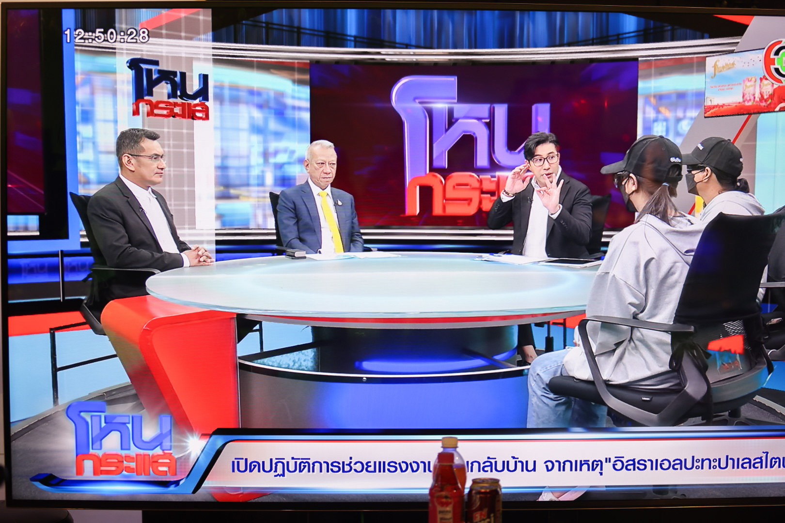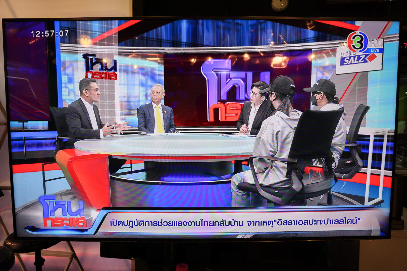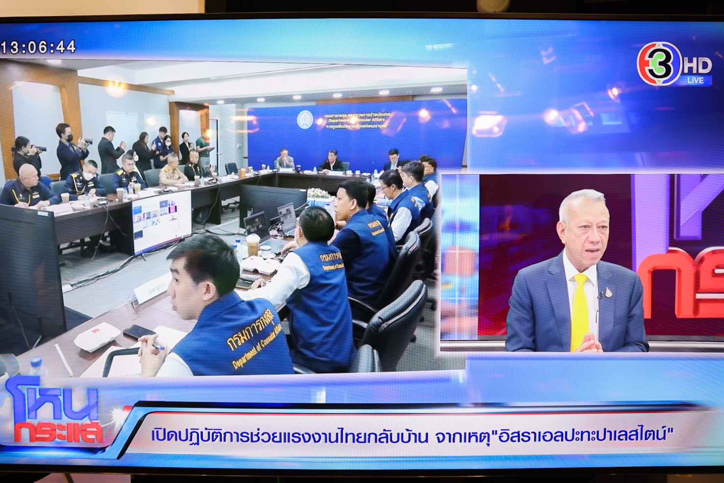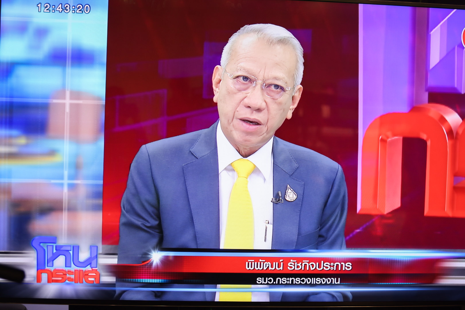 On October 9, 2023, at 12.30 hours, the Labour Minister, Mr. Phiphat Ratchakitprakarn, gave an interview on the “Hone-Krasae” program on the topic of operations to help Thai workers return home from the “Israel-Palestine conflicts.” Mr. Kanchai Kamnerdploy was the program host. The occasion took place on Thai TV Channel 3.