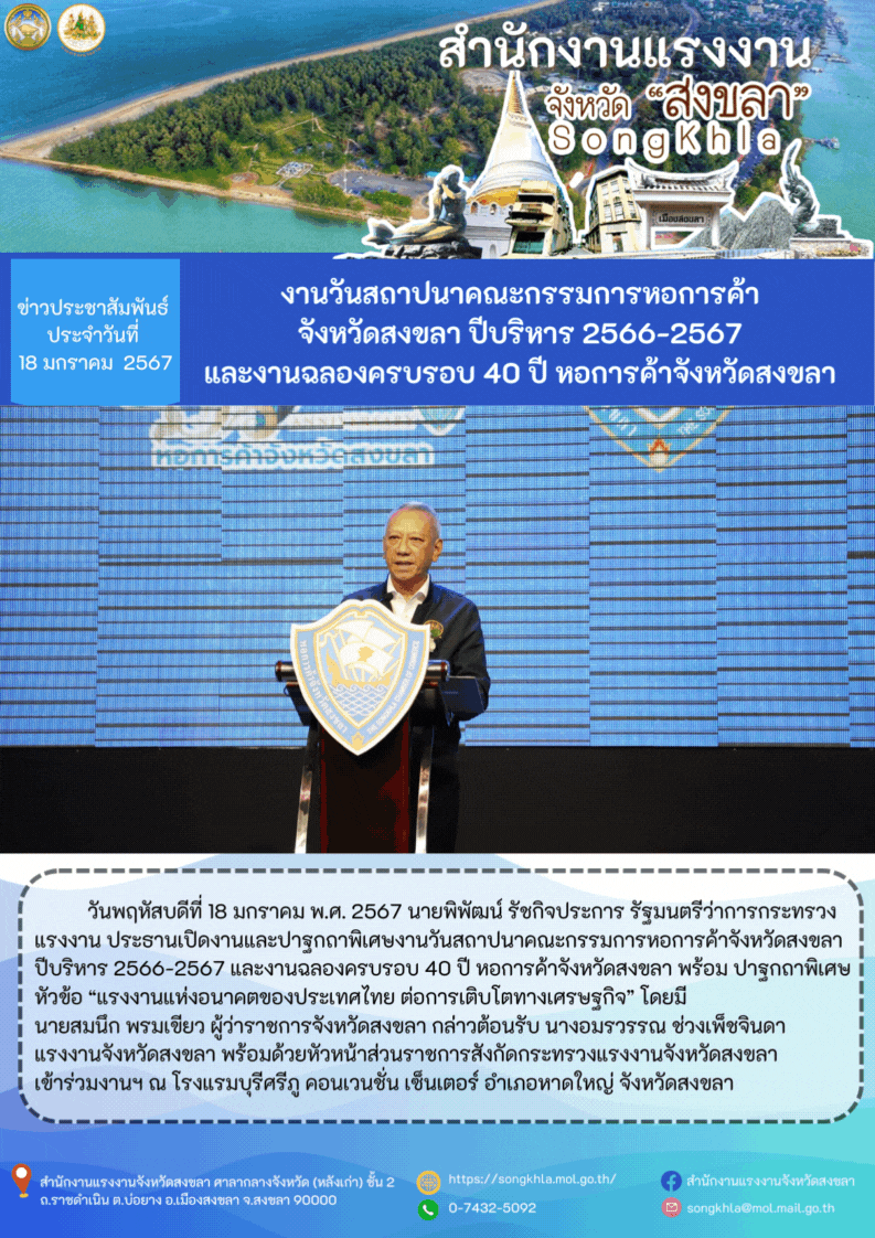 วันพฤหัสบดีที่ 18 มกราคม พ.ศ. 2567 นายพิพัฒน์ รัชกิจประการ รัฐมนตรีว่าการกระทรวงแรงงาน ประธานเปิดงานและปาฐกถาพิเศษงานวันสถาปนาคณะกรรมการหอการค้าจังหวัดสงขลา ปีบริหาร 2566-2567 และงานฉลองครบรอบ 40 ปี หอการค้าจังหวัดสงขลา พร้อม ปาฐกถาพิเศษหัวข้อ “แรงงานแห่งอนาคตของประเทศไทย ต่อการเติบโตทางเศรษฐกิจ” โดยมี นายสมนึก พรมเขียว ผู้ว่าราชการจังหวัดสงขลา กล่าวต้อนรับ นางอมรวรรณ ช่วงเพ็ชจินดา แรงงานจังหวัดสงขลา พร้อมด้วยหัวหน้าส่วนราชการสังกัดกระทรวงแรงงานจังหวัดสงขลา เข้าร่วมงานฯ ณ โรงแรมบุรีศรีภู คอนเวนชั่น เซ็นเตอร์ อำเภอหาดใหญ่ จังหวัดสงขลา