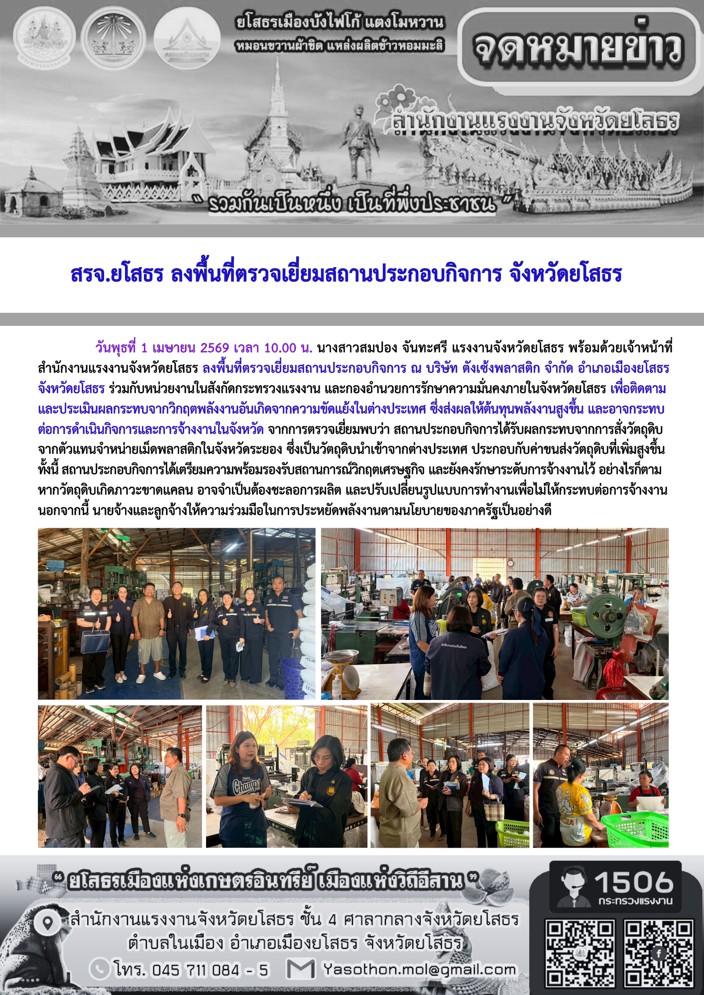 สรจ.ยโสธร ลงพื้นที่ตรวจเยี่ยมสถานประกอบกิจการ จังหวัดยโสธร
