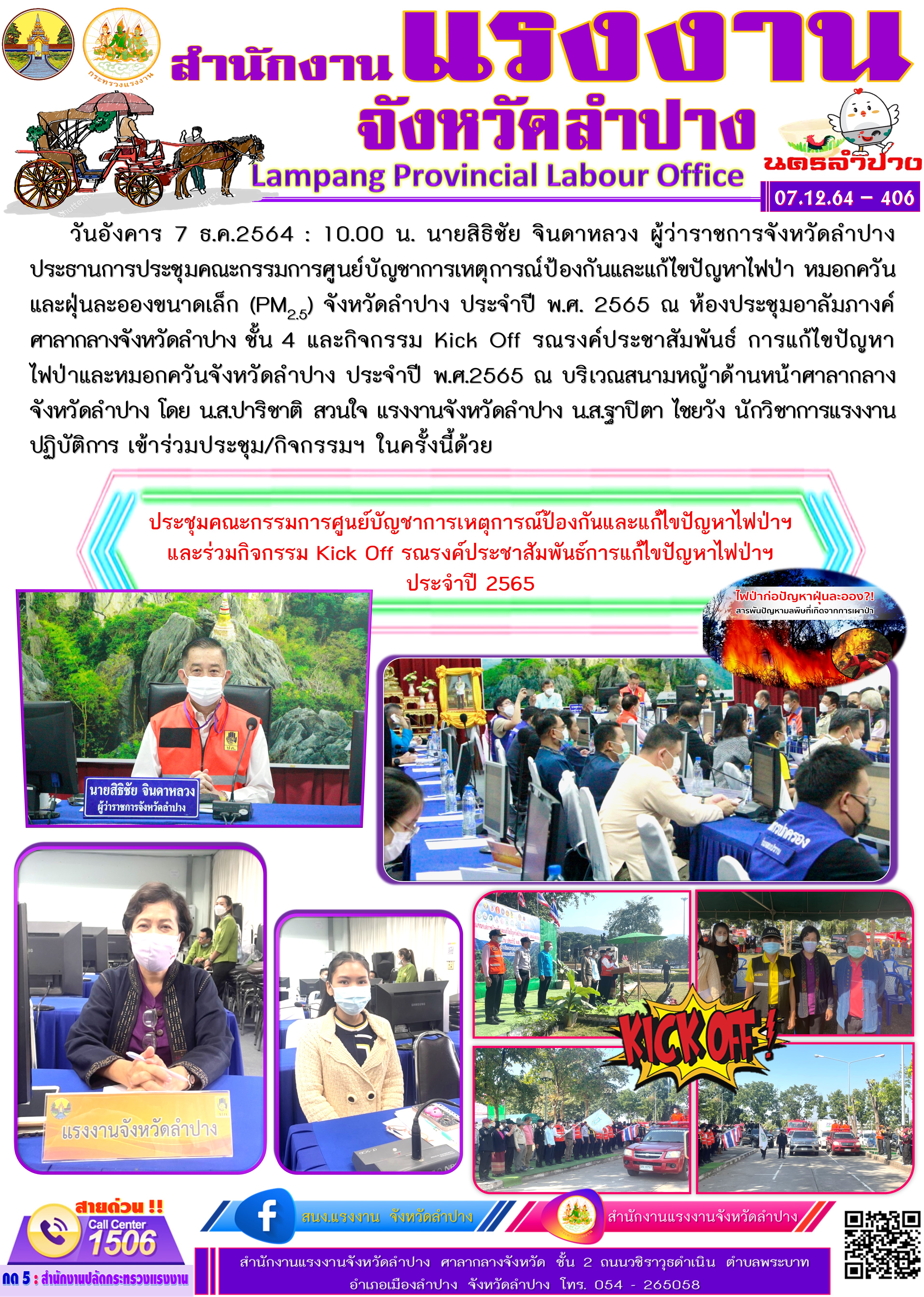 สรจ.ลำปาง ร่วมประชุมคณะกรรมการศูนย์บัญชาการเหตุการณ์ป้องกันและแก้ไขปัญหาไฟป่า หมอกควัน และฝุ่นละอองขนาดเล็ก (PM2.5) จังหวัดลำปาง ประจำปี พ.ศ. 2565 และกิจกรรม Kick Off รณรงค์ประชาสัมพันธ์