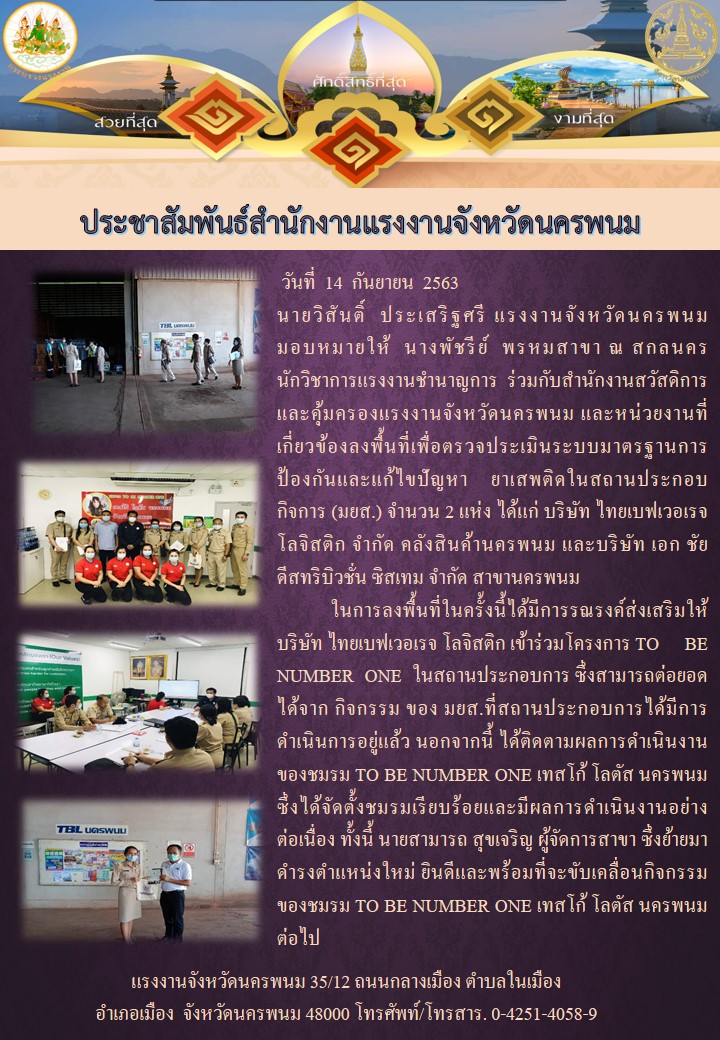 เมื่อวันที่ 14 กันยายน 2563 นายวิสันติ์ ประเสริฐศรี แรงงานจังหวัดนครพนม มอบหมายให้ นางพัชรีย์ พรหมสาขา ณ สกลนคร นักวิชาการแรงงานชำนาญการ ร่วมกับสำนักงานสวัสดิการและคุ้มครองแรงงานจังหวัดนครพนม และหน่วยงานที่เกี่ยวข้องลงพื้นที่เพื่อตรวจประเมินระบบมาตรฐานการป้องกันและแก้ไขปัญหายาเสพติดในสถานประกอบกิจการ (มยส.) จำนวน 2 แห่ง ได้แก่ บริษัท ไทยเบฟเวอเรจ โลจิสติก จำกัด คลังสินค้านครพนม และบริษัท เอก ชัย ดีสทริบิวชั่น ซิสเทม จำกัด สาขานครพนม