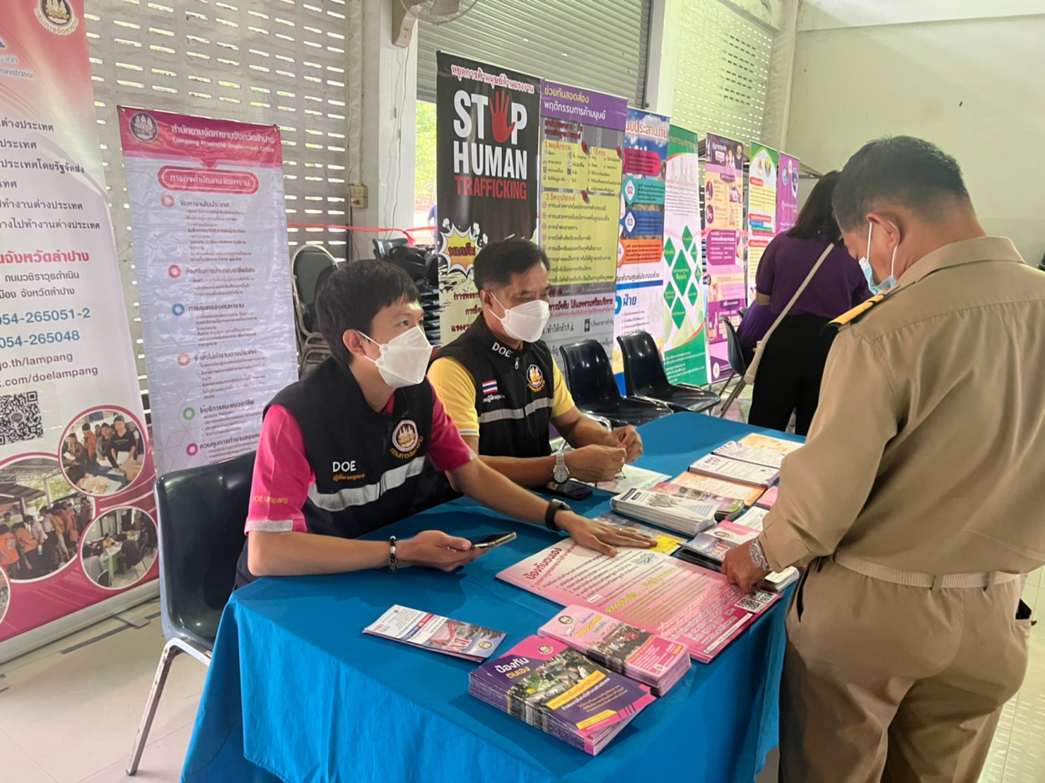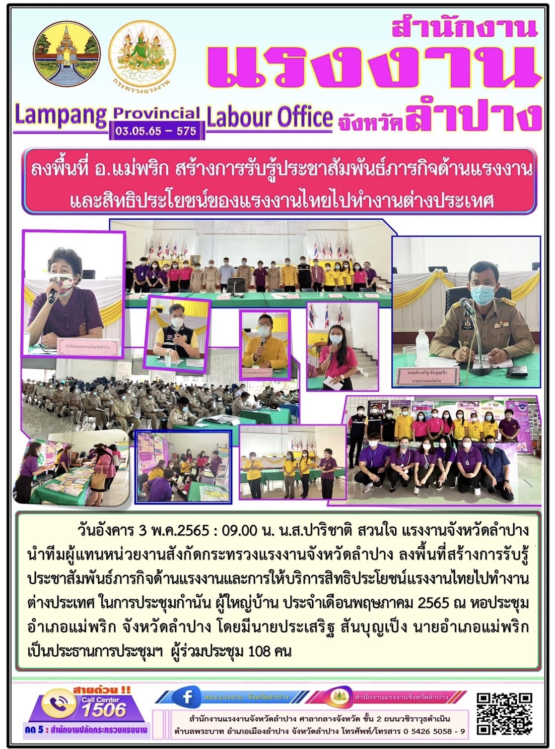 วันอังคาร 3 พ.ค.2565 : 09.00 น. น.ส.ปาริชาติ สวนใจ แรงงานจังหวัดลำปาง นำทีมผู้แทนหน่วยงานสังกัดกระทรวงแรงงานจังหวัดลำปาง ลงพื้นที่สร้างการรับรู้ประชาสัมพันธ์ภารกิจด้านแรงงานและการให้บริการสิทธิประโยชน์แรงงานไทยไปทำงานต่างประเทศ ในการประชุมกำนัน ผู้ใหญ่บ้าน ประจำเดือนพฤษภาคม 2565 ณ หอประชุมอำเภอแม่พริก จังหวัดลำปาง โดยมีนายประเสริฐ สันบุญเป็ง นายอำเภอแม่พริก เป็นประธานการประชุมฯ ผู้ร่วมประชุม 108 คน