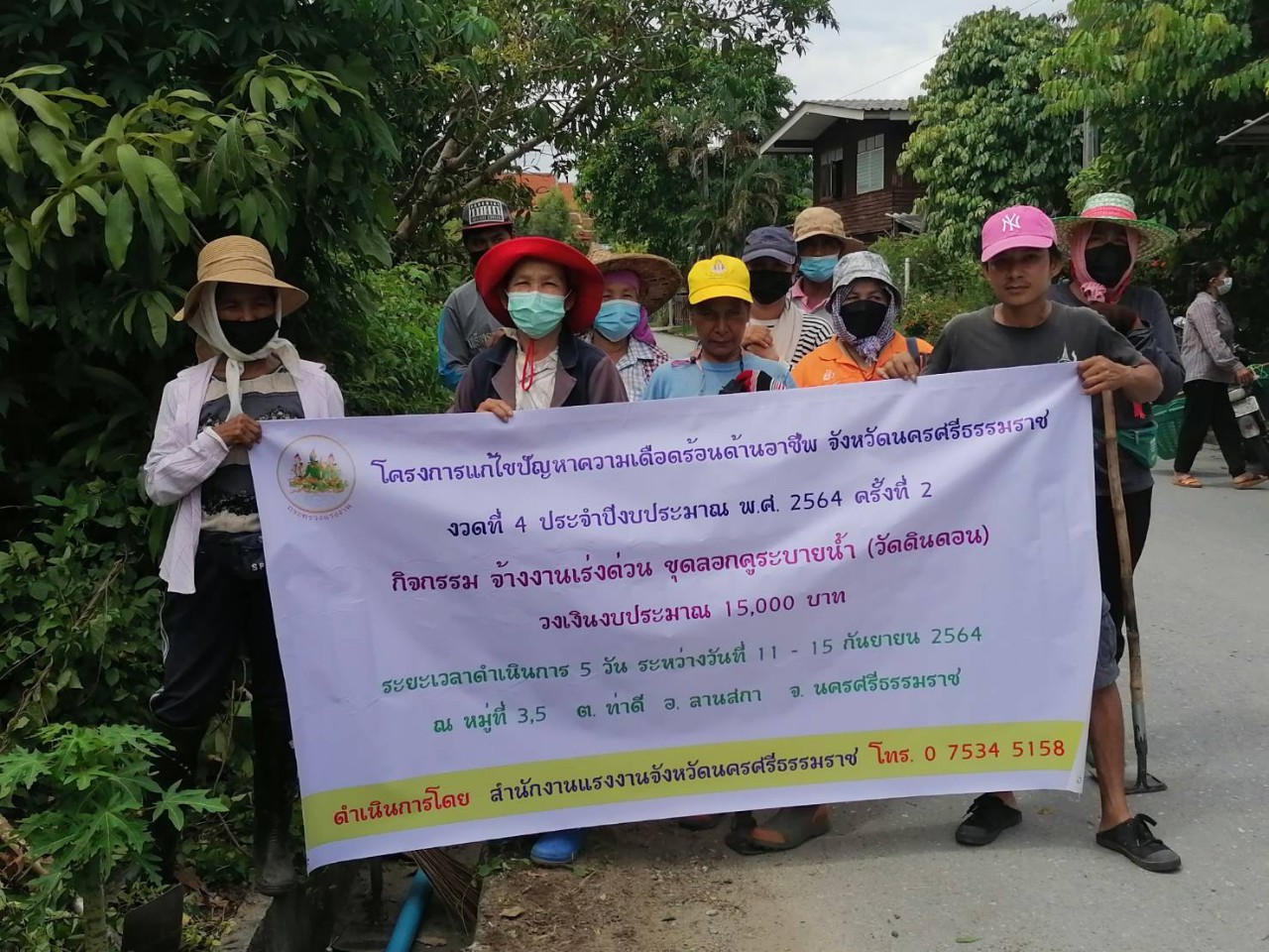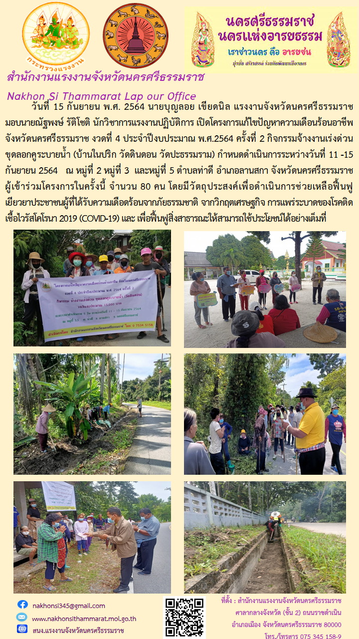 กิจกรรมจ้างงานเร่งด่วน ขุดลอกคูระบายน้ำ (บ้านในปริก วัดดินดอน วัดปะธรรมราม) กำหนดดำเนินการระหว่างวันที่ 11 -15 กันยายน 2564 ณ หมู่ที่ 2 หมู่ที่ 3 และหมู่ที่ 5 ตำบลท่าดี อำเภอลานสกา จังหวัดนครศรีธรรมราช ผู้เข้าร่วมโครงการในครั้งนี้ จำนวน 80 คน โดยมีวัตถุประสงค์เพื่อดำเนินการช่วยเหลือฟื้นฟูเยียวยาประชาชนผู้ที่ได้รับความเดือดร้อนจากภัยธรรมชาติ