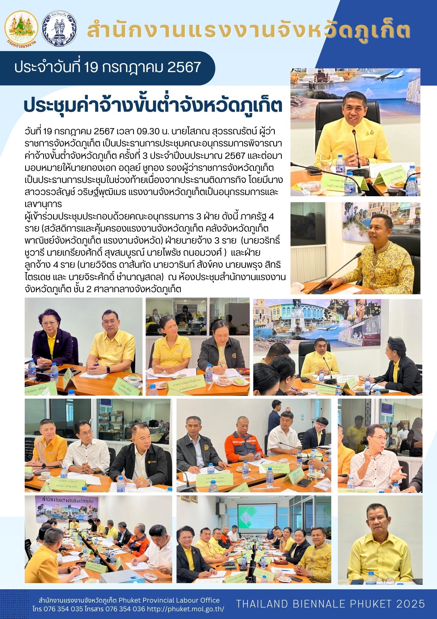 วันที่ 19 กรกฎาคม 2567 เวลา 09.30 น. นายโสภณ สุวรรณรัตน์ ผู้ว่าราชการจังหวัดภูเก็ต เป็นประธานการประชุมคณะอนุกรรมการพิจารณาค่าจ้างขั้นต่ำจังหวัดภูเก็ต ครั้งที่ 3 ประจำปีงบประมาณ 2567
