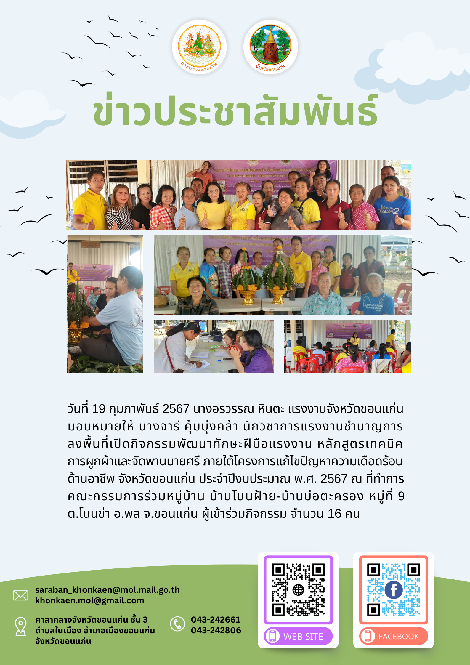 วันที่ 19 กุมภาพันธ์ 2567 นางอรวรรณ หินตะ แรงงานจังหวัดขอนแก่น มอบหมายให้ นางจารี คุ้มบุ่งคล้า นักวิชาการแรงงานชำนาญการ ลงพื้นที่เปิดกิจกรรมพัฒนาทักษะฝีมือแรงงาน หลักสูตรเทคนิค การผูกผ้าและจัดพานบายศรี ภายใต้โครงการแก้ไขปัญหาความเดือดร้อน ด้านอาชีพ จังหวัดขอนแก่น ประจำปีงบประมาณ พ.ศ. 2567