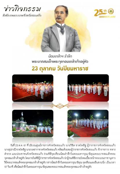 วันที่ 23 ต.ค. 61 ที่ บริเวณศูนย์ราชการจังหวัดสระแก้ว นายวิชิต ชาตไพสิฐ ผู้ว่าราชการจังหวัดสระแก้ว นางสุปราณี ชาตไพสิฐ นายกเหล่ากาชาดจังหวัดสระแก้ว พร้อมด้วยรองผู้ว่าราชการจังหวัดสระแก้ว ข้าราชการ ทหาร ตำรวจ และประชาชนจังหวัดสระแก้ว ร่วมพิธีจุดเทียนน้อมรำ