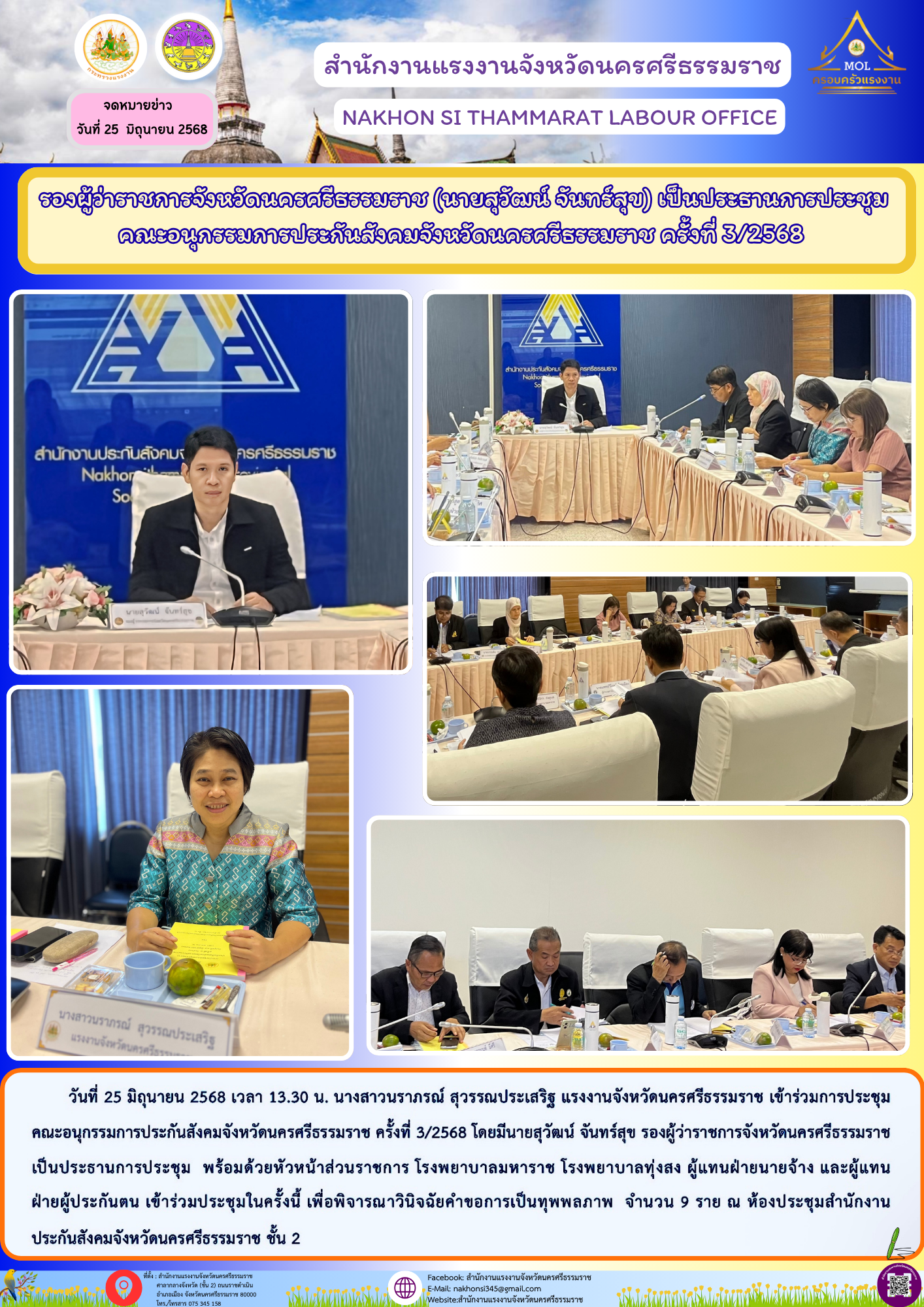 วันที่ 25 มิถุนายน 2568 เวลา 13.30 น. นางสาวนราภรณ์ สุวรรณประเสริฐ แรงงานจังหวัดนครศรีธรรมราช เข้าร่วมการประชุมคณะอนุกรรมการประกันสังคมจังหวัดนครศรีธรรมราช ครั้งที่ 3/2568 โดยมีนายสุวัฒน์ จันทร์สุข รองผู้ว่าราชการจังหวัดนครศรีธรรมราช เป็นประธานการประชุม พร้อมด้วยหัวหน้าส่วนราชการ โรงพยาบาลมหาราช โรงพยาบาลทุ่งสง ผู้แทนฝ่ายนายจ้าง และผู้แทนฝ่ายผู้ประกันตน เข้าร่วมประชุมในครั้งนี้ เพื่อพิจารณาวินิจฉัยคำขอการเป็นทุพพลภาพ จำนวน 9 ราย ณ ห้องประชุมสำนักงานประกันสังคมจังหวัดนครศรีธรรมราช ชั้น 2