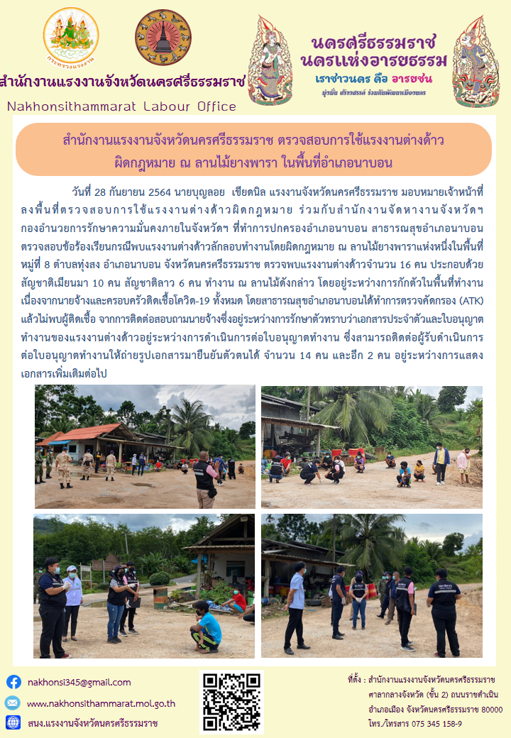 วันที่ 28 กันยายน 2564 นายบุญลอย เขียดนิล แรงงานจังหวัดนครศรีธรรมราช มอบหมายเจ้าหน้าที่ ลงพื้นที่ตรวจสอบการใช้แรงงานต่างด้าวผิดกฎหมาย ร่วมกับสำนักงานจัดหางานจังหวัดฯ กองอำนวยการรักษาความมั่นคงภายในจังหวัดฯ ที่ทำการปกครองอำเภอนาบอน สาธารณสุขอำเภอนาบอน ตรวจสอบข้อร้องเรียนกรณีพบแรงงานต่างด้าวลักลอบทำงานโดยผิดกฎหมาย ณ ลานไม้ยางพาราแห่งหนึ่งในพื้นที่หมู่ที่ 8 ตำบลทุ่งสง อำเภอนาบอน จังหวัดนครศรีธรรมราช ตรวจพบแรงงานต่างด้าวจำนวน 16 คน ประกอบด้วย สัญชาติเมียนมา 10 คน สัญชาติลาว 6 คน ทำงาน ณ ลานไม้ดังกล่าว โดยอยู่ระหว่างการกักตัวในพื้นที่ทำงานเนื่องจากนายจ้างและครอบครัวติดเชื้อโควิด-19 ทั้งหมด โดยสาธารณสุขอำเภอนาบอนได้ทำการตรวจคัดกรอง (ATK) แล้วไม่พบผู้ติดเชื้อ จากการติดต่อสอบถามนายจ้างซึ่งอยู่ระหว่างการรักษาตัวทราบว่าเอกสารประจำตัวและใบอนุญาตทำงานของแรงงานต่างด้าวอยู่ระหว่างการดำเนินการต่อใบอนุญาตทำงาน ซึ่งสามารถติดต่อผู้รับดำเนินการต่อใบอนุญาตทำงานให้ถ่ายรูปเอกสารมายืนยันตัวตนได้ จำนวน 14 คน และอีก 2 คน อยู่ระหว่างการแสดงเอกสารเพิ่มเติมต่อไป