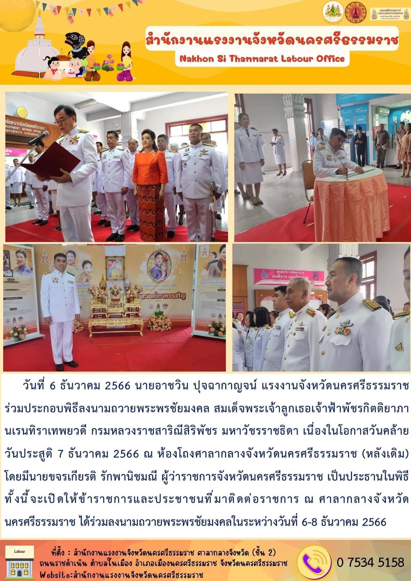 สรจ.นครศรีธรรมราช เข้าร่วมประกอบพิธีลงนามถวายพระพรชัยมงคล สมเด็จพระเจ้าลูกเธอเจ้าฟ้าพัชรกิตติยาภา นเรนทิราเทพยวดี กรมหลวงราชสาริณีสิริพัชร มหาวัชรราชธิดา เนื่องในโอกาสวันคล้ายวันประสูติ 7 ธันวาคม 2566 ณ ห้องโถงศาลากลางจังหวัดนครศรีธรรมราช (หลังเดิม)