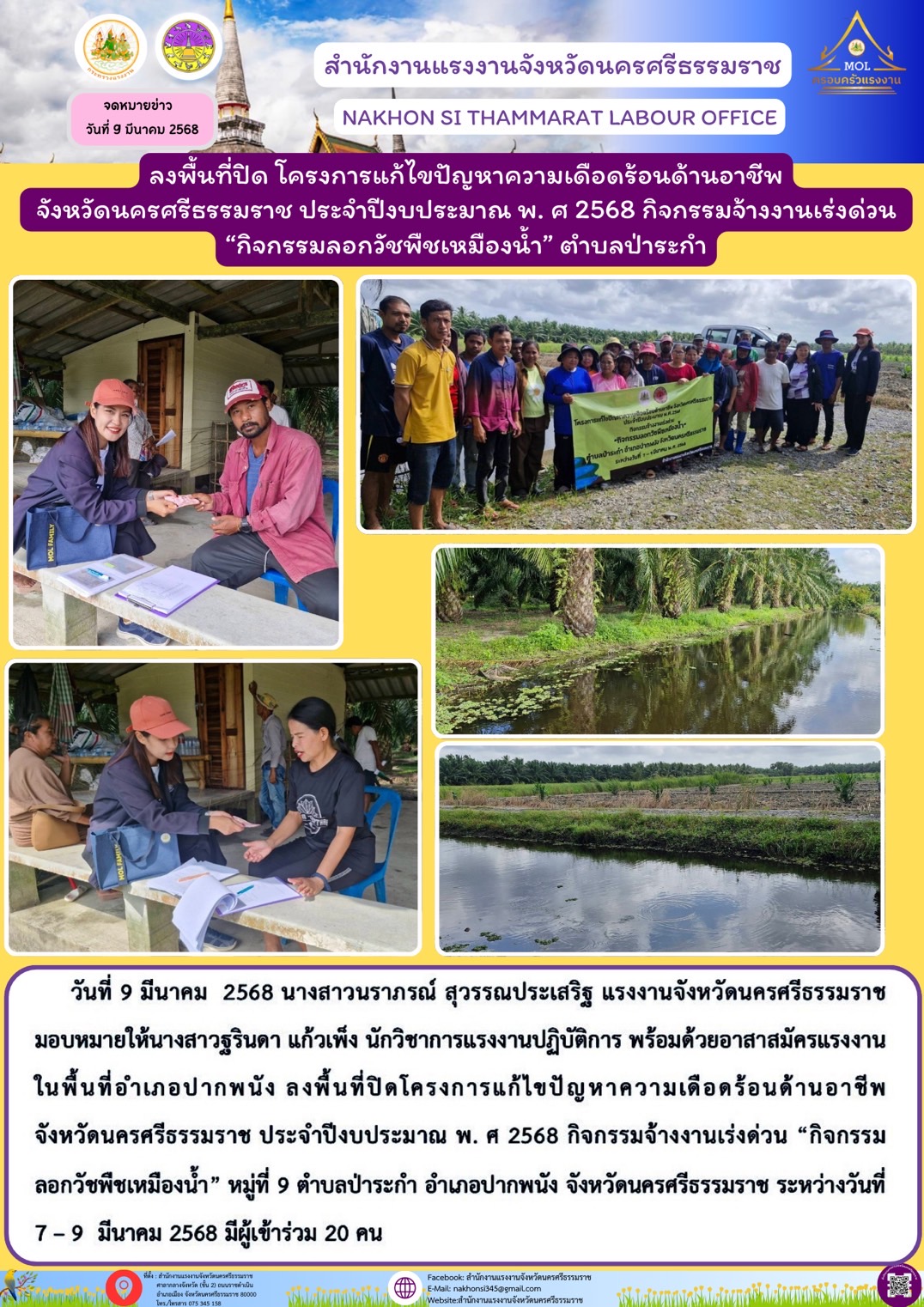 วันที่ 9 มีนาคม 2568 นางสาวนราภรณ์ สุวรรณประเสริฐ แรงงานจังหวัดนครศรีธรรมราช มอบหมายให้นางสาวฐรินดา แก้วเพ็ง นักวิชาการแรงงานปฏิบัติการ พร้อมด้วยอาสาสมัครแรงงานในพื้นที่อำเภอปากพนัง ลงพื้นที่ปิดโครงการแก้ไขปัญหาความเดือดร้อนด้านอาชีพ จังหวัดนครศรีธรรมราช ประจำปีงบประมาณ พ. ศ 2568 กิจกรรมจ้างงานเร่งด่วน “กิจกรรมลอกวัชพืชเหมืองน้ำ” หมู่ที่ 9 ตำบลป่าระกำ อำเภอปากพนัง จังหวัดนครศรีธรรมราช ระหว่างวันที่ 7-9 มีนาคม 2568 มีผู้เข้าร่วม 20 คน