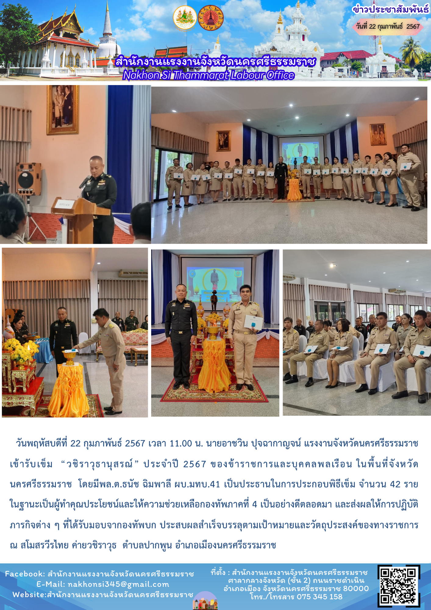 วันพฤหัสบดีที่ 22 กุมภาพันธ์ 2567 เวลา 11.00 น. นายอาชวิน ปุจฉากาญจน์ แรงงานจังหวัดนครศรีธรรมราช เข้ารับเข็ม “วชิราวุธานุสรณ์” ประจำปี 2567 ของข้าราชการและบุคคลพลเรือน ในพื้นที่จังหวัดนครศรีธรรมราช โดยมีพล.ต.ธนัช ฉิมพาลี ผบ.มทบ.41 เป็นประธานในการประกอบพิธีเข็ม จำนวน 42 ราย ในฐานะเป็นผู้ทำคุณประโยชน์และให้ความช่วยเหลือกองทัพภาคที่ 4 เป็นอย่างดีตลอดมา และส่งผลให้การปฏิบัติภารกิจต่าง ๆ ที่ได้รับมอบจากองทัพบก ประสบผลสำเร็จบรรลุตามเป้าหมายและวัตถุประสงค์ของทางราชการ ณ สโมสรวีรไทย ค่ายวชิราวุธ ตำบลปากพูน อำเภอเมืองนครศรีธรรมราช