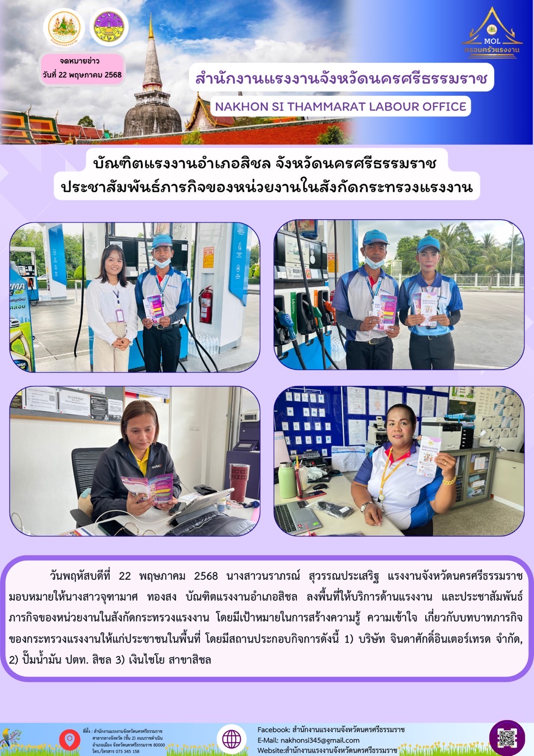 วันพฤหัสบดีที่ 22 พฤษภาคม 2568 นางสาวนราภรณ์ สุวรรณประเสริฐ แรงงานจังหวัดนครศรีธรรมราช มอบหมายให้นางสาวจุฑามาศ ทองสง บัณฑิตแรงงานอำเภอสิชล ลงพื้นที่ให้บริการด้านแรงงาน และประชาสัมพันธ์ภารกิจของหน่วยงานในสังกัดกระทรวงแรงงาน โดยมีเป้าหมายในการสร้างความรู้ ความเข้าใจ เกี่ยวกับบทบาทภารกิจของกระทรวงแรงงานให้แก่ประชาชนในพื้นที่ โดยมีสถานประกอบกิจการดังนี้ 1) บริษัท จินดาศักดิ์อินเตอร์เทรด จำกัด, 2) ปั๊มน้ำมัน ปตท. สิชล 3) เงินไชโย สาขาสิชล