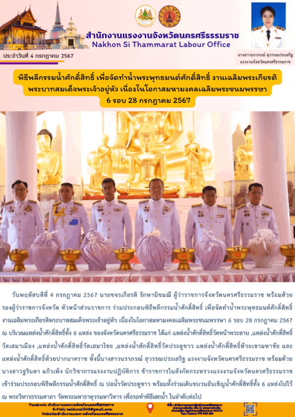 สรจ.นครศรีธรรมราช พิธีพลีกรรมน้ำศักดิ์สิทธิ เพื่อจัดทำน้ำพระพุทธมนต์ศักดิ์สิทธิ์ งานเฉลิมพระเกียรติ พระบาทสมเด็จพระเจ้าอยู่หัว เนื่องในโอกาสมหามงคลเฉลิมพระชนมพรรษา 6 รอบ 28 กรกฎาคม 2567
