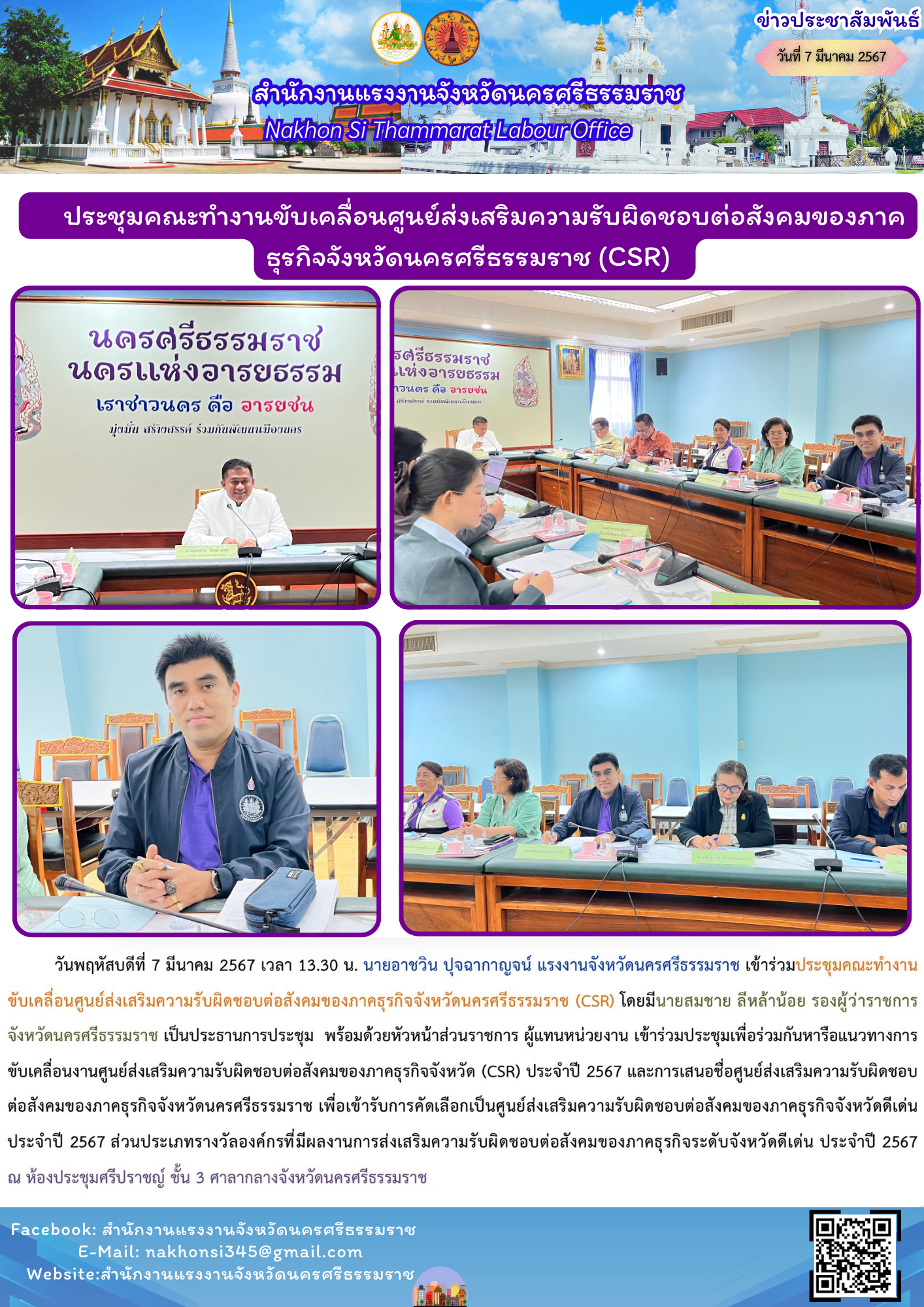 วันพฤหัสบดีที่ 7 มีนาคม 2567 เวลา 13.30 น. นายอาชวิน ปุจฉากาญจน์ แรงงานจังหวัดนครศรีธรรมราช เข้าร่วมประชุมคณะทำงานขับเคลื่อนศูนย์ส่งเสริมความรับผิดชอบต่อสังคมของภาคธุรกิจจังหวัดนครศรีธรรมราช (CSR) โดยมีนายสมชาย ลีหล้าน้อย รองผู้ว่าราชการจังหวัดนครศรีธรรมราช เป็นประธานการประชุม