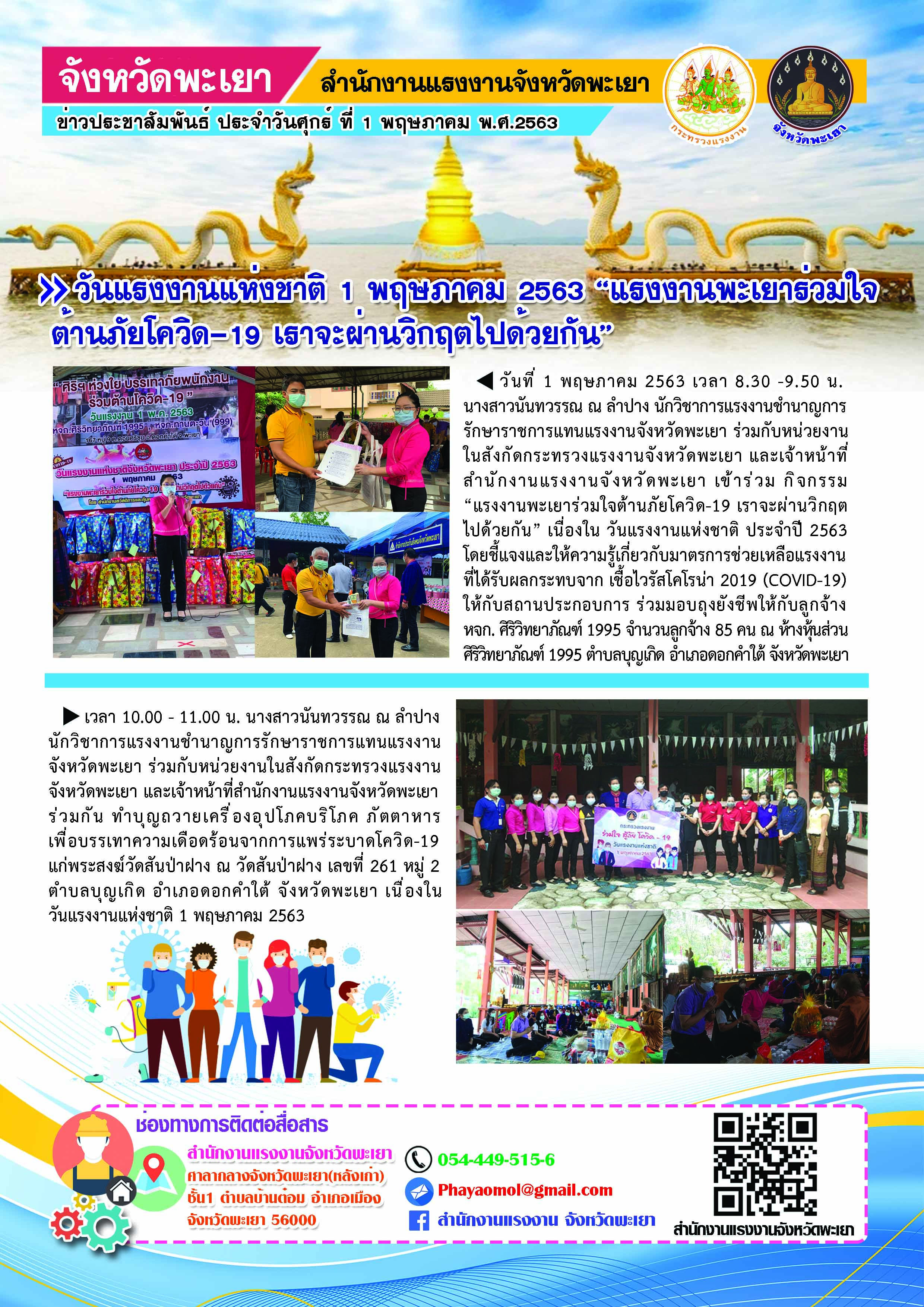 วันแรงงานแห่งชาติ 1 พฤษภาคม 2563 “แรงงานพะเยาร่วมใจ ต้านภัยโควิด-19 เราจะผ่านวิกฤตไปด้วยกัน”