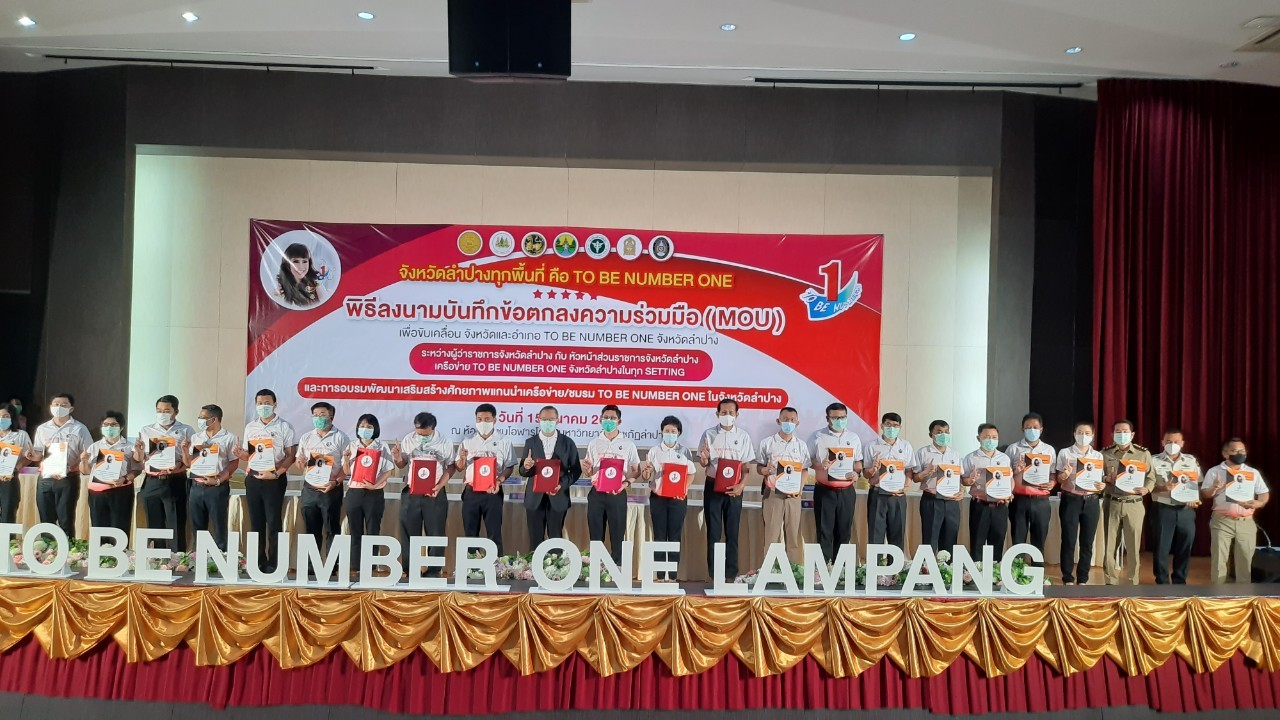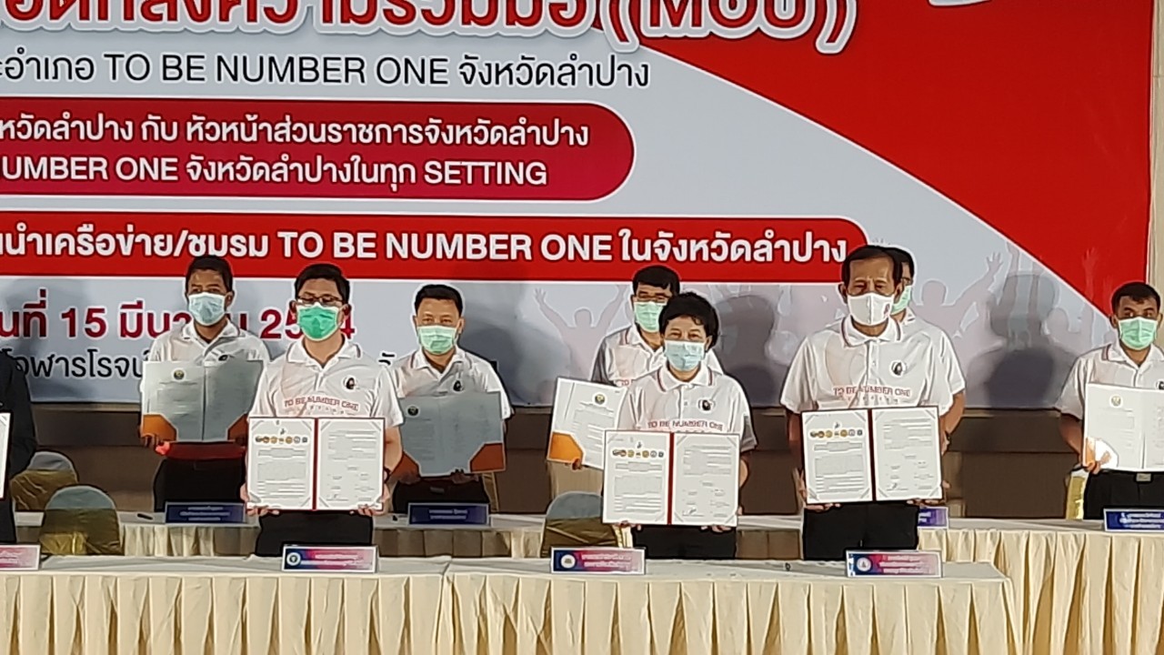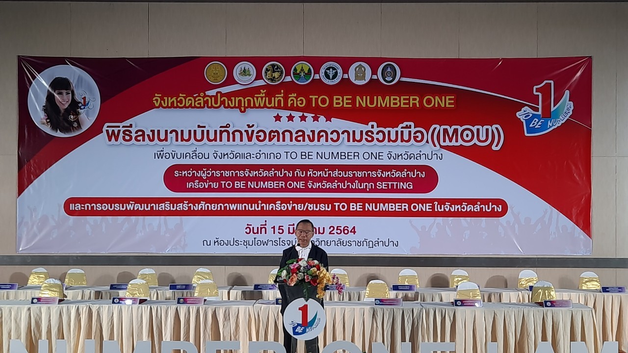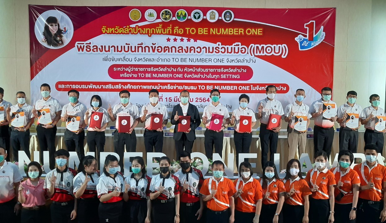 เมื่อวันที่ 15 มีนาคม 2564 เวลา 10.00 น. นายณรงค์ศักดิ์ โอสถธนากร ผู้ว่าราชการจังหวัดลำปาง เป็นประธานในพิธีลงนามบันทึกข้อตกลงความร่วมมือ (MOU) ระหว่างผู้ว่าราชการจังหวัดลำปาง หัวหน้าส่วนราชการระดับจังหวัด 6 กระทรวงหลัก (กระทรวงมหาดไทย กระทรวงสาธารณสุข กระทรวงแรงงาน กระทรวงศึกษาธิการ กระทรวงยุติธรรม และกระทรวงการพัฒนาสังคมและความมั่นคงของมนุษย์) นายอำเภอ และเครือข่าย TO BE NUMBER ONE ทุก SETTING ในจังหวัดลำปางเพื่อร่วมกันขับเคลื่อนโครงการ TO BE NUMBER ONE ในทุก SETTING /ทุกพื้นที่ในจังหวัดลำปาง โดย น.ส.ปาริชาติ สวนใจ แรงงานจังหวัดลำปาง ในฐานะผู้ดูแลชมรม TO BE NUMBER ONE ในสถานประกอบการ ร่วมลงนามบันทึกข้อตกลงความร่วมมือฯ (MOU) ด้วย ณ ห้องประชุมใหญ่ ตึกโอฬาร มหาวิทยาลัยราชภัฏลำปาง อำเภอเมืองลำปาง จังหวัดลำปาง