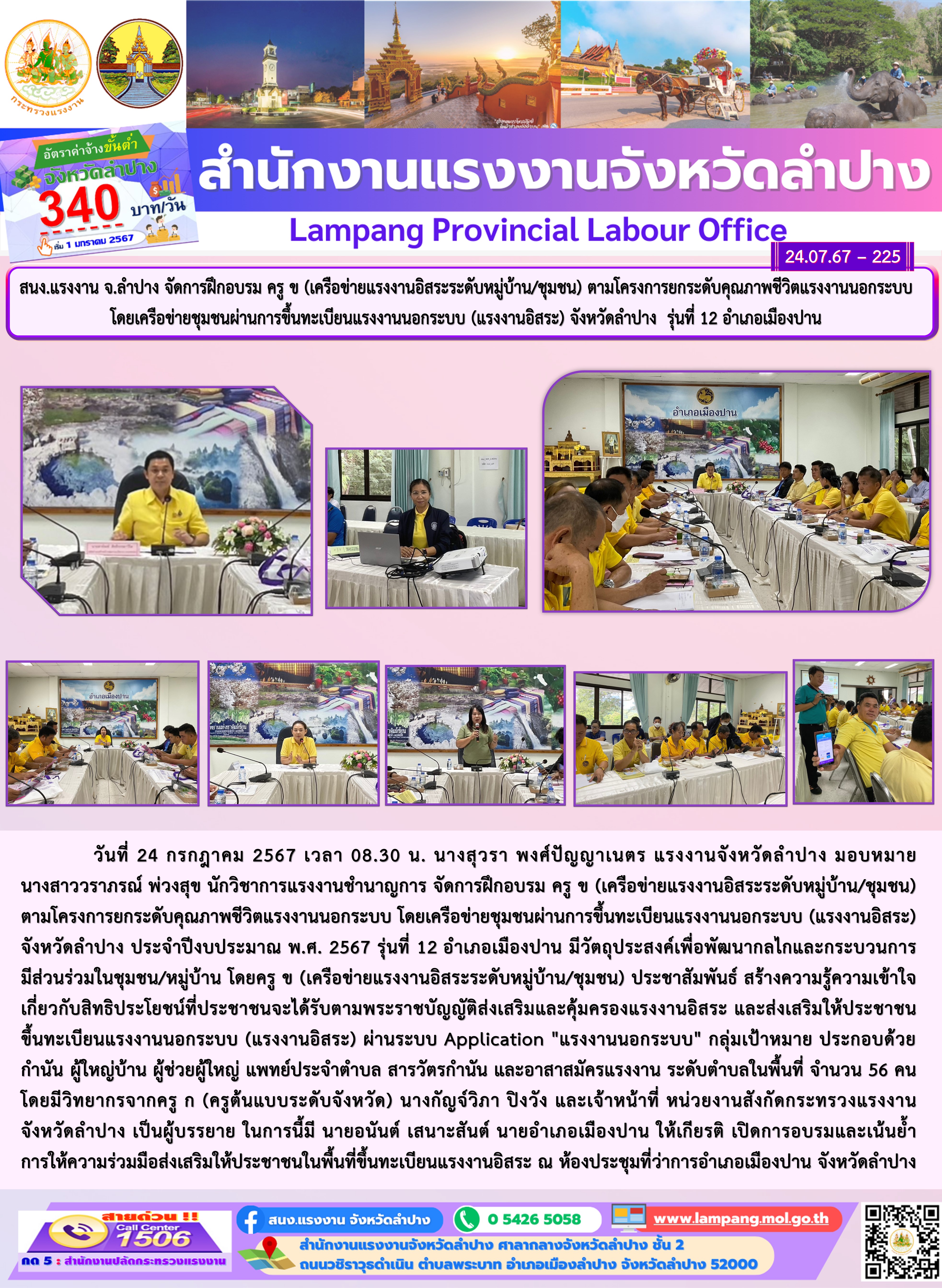 วันที่ 24 กรกฎาคม 2567 เวลา 08.30 น. นางสุวรา พงศ์ปัญญาเนตร แรงงานจังหวัดลำปาง มอบหมายนางสาววราภรณ์ พ่วงสุข นักวิชาการแรงงานชำนาญการ จัดการฝึกอบรม ครู ข (เครือข่ายแรงงานอิสระระดับหมู่บ้าน/ชุมชน) ตามโครงการยกระดับคุณภาพชีวิตแรงงานนอกระบบ โดยเครือข่ายชุมชนผ่านการขึ้นทะเบียนแรงงานนอกระบบ (แรงงานอิสระ) จังหวัดลำปาง ประจำปีงบประมาณ พ.ศ. 2567 รุ่นที่ 12 อำเภอเมืองปาน มีวัตถุประสงค์เพื่อพัฒนากลไกและกระบวนการ มีส่วนร่วมในชุมชน/หมู่บ้าน โดยครู ข (เครือข่ายแรงงานอิสระระดับหมู่บ้าน/ชุมชน) ประชาสัมพันธ์ สร้างความรู้ความเข้าใจเกี่ยวกับสิทธิประโยชน์ที่ประชาชนจะได้รับตามพระราชบัญญัติส่งเสริมและคุ้มครองแรงงานอิสระ และส่งเสริมให้ประชาชนขึ้นทะเบียนแรงงานนอกระบบ (แรงงานอิสระ) ผ่านระบบ Application “แรงงานนอกระบบ” กลุ่มเป้าหมาย ประกอบด้วย กำนัน ผู้ใหญ่บ้าน ผู้ช่วยผู้ใหญ่ แพทย์ประจำตำบล สารวัตรกำนัน และอาสาสมัครแรงงาน ระดับตำบลในพื้นที่ จำนวน 56 คน โดยมีวิทยากรจากครู ก (ครูต้นแบบระดับจังหวัด) นางกัญจ์วิภา ปิงวัง และเจ้าหน้าที่ หน่วยงานสังกัดกระทรวงแรงงานจังหวัดลำปาง เป็นผู้บรรยาย ในการนี้มี นายอนันต์ เสนาะสันต์ นายอำเภอเมืองปาน ให้เกียรติ เปิดการอบรมและเน้นย้ำการให้ความร่วมมือส่งเสริมให้ประชาชนในพื้นที่ขึ้นทะเบียนแรงงานอิสระ ณ ห้องประชุมที่ว่าการอำเภอเมืองปาน จังหวัดลำปาง