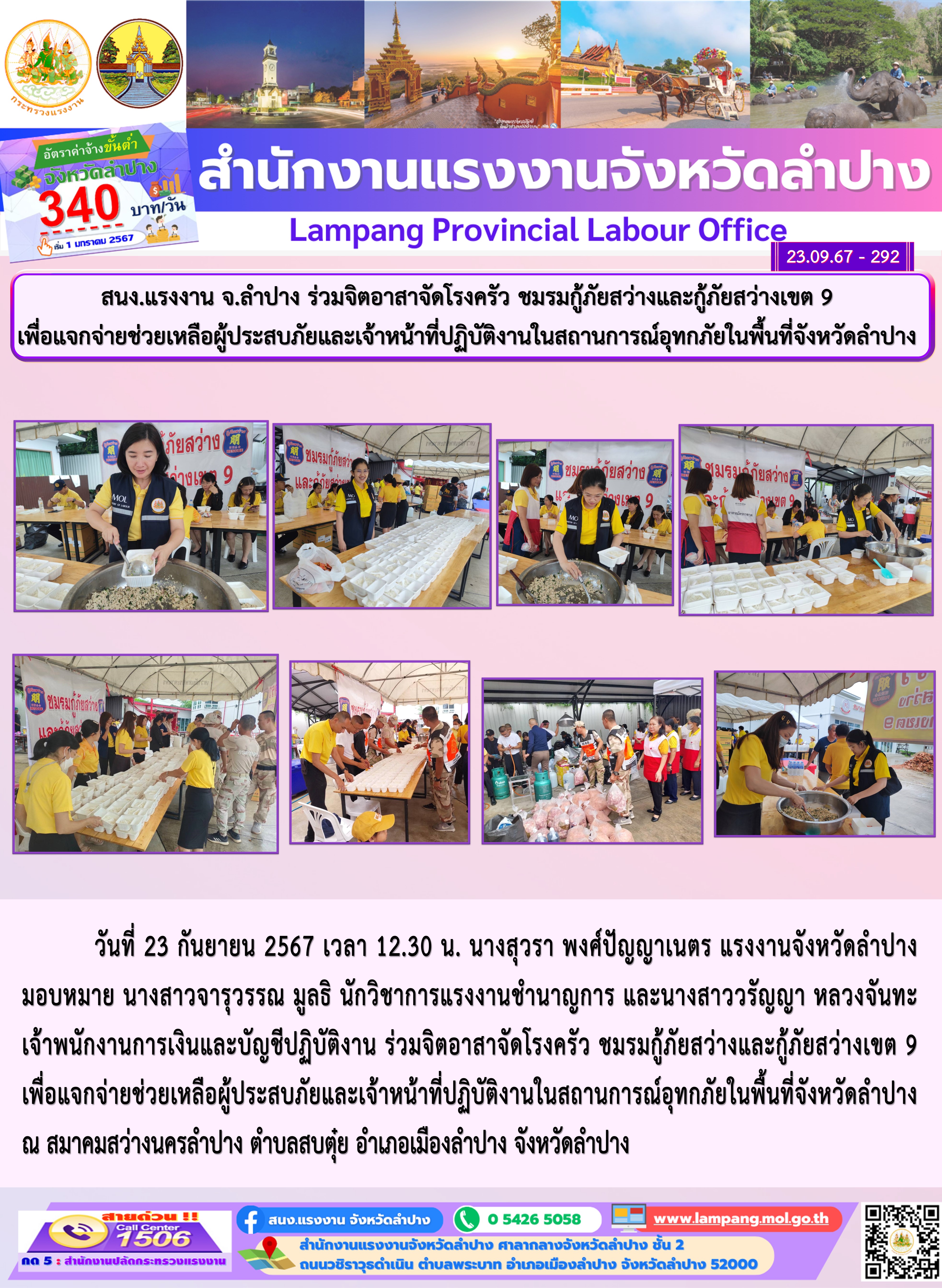 วันที่ 23 กันยายน 2567 เวลา 12.30 น. นางสุวรา พงศ์ปัญญาเนตร แรงงานจังหวัดลำปาง มอบหมาย นางสาวจารุวรรณ มูลธิ นักวิชาการแรงงานชำนาญการ และนางสาววรัญญา หลวงจันทะ เจ้าพนักงานการเงินและบัญชีปฏิบัติงาน ร่วมจิตอาสาจัดโรงครัว ชมรมกู้ภัยสว่างและกู้ภัยสว่างเขต 9 เพื่อแจกจ่ายช่วยเหลือผู้ประสบภัยและเจ้าหน้าที่ปฏิบัติงานในสถานการณ์อุทกภัยในพื้นที่จังหวัดลำปาง ณ สมาคมสว่างนครลำปาง ตำบลสบตุ๋ย อำเภอเมืองลำปาง จังหวัดลำปาง