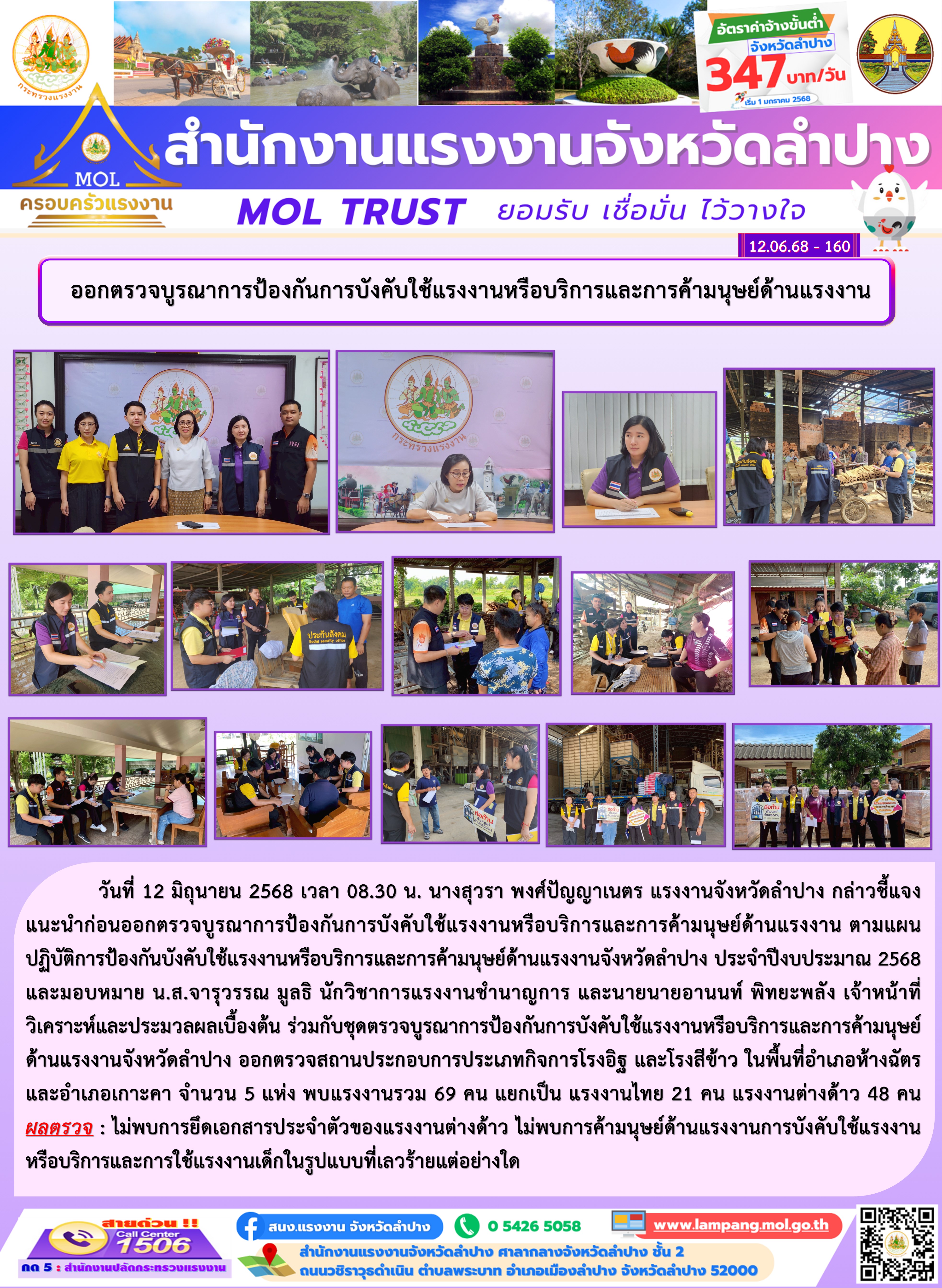 วันที่ 12 มิถุนายน 2568 เวลา 08.30 น. นางสุวรา พงศ์ปัญญาเนตร แรงงานจังหวัดลำปาง กล่าวชี้แจง แนะนำก่อนออกตรวจบูรณาการป้องกันการบังคับใช้แรงงานหรือบริการและการค้ามนุษย์ด้านแรงงาน ตามแผนปฏิบัติการป้องกันบังคับใช้แรงงานหรือบริการและการค้ามนุษย์ด้านแรงงานจังหวัดลำปาง ประจำปีงบประมาณ 2568 และมอบหมาย น.ส.จารุวรรณ มูลธิ นักวิชาการแรงงานชำนาญการ และนายอานนท์ พิทยะพลัง เจ้าหน้าที่วิเคราะห์และประมวลผลเบื้องต้น ร่วมกับชุดตรวจบูรณาการป้องกันการบังคับใช้แรงงานหรือบริการและการค้ามนุษย์ด้านแรงงานจังหวัดลำปาง ออกตรวจสถานประกอบการประเภทกิจการโรงอิฐ และโรงสีข้าว ในพื้นที่อำเภอห้างฉัตรและอำเภอเกาะคา จำนวน 5 แห่ง พบแรงงานรวม 69 คน แยกเป็น แรงงานไทย 21 คน แรงงานต่างด้าว 48 คน ผลตรวจ : ไม่พบการยึดเอกสารประจำตัวของแรงงานต่างด้าว ไม่พบการค้ามนุษย์ด้านแรงงานการบังคับใช้แรงงาน หรือบริการและการใช้แรงงานเด็กในรูปแบบที่เลวร้ายแต่อย่างใด