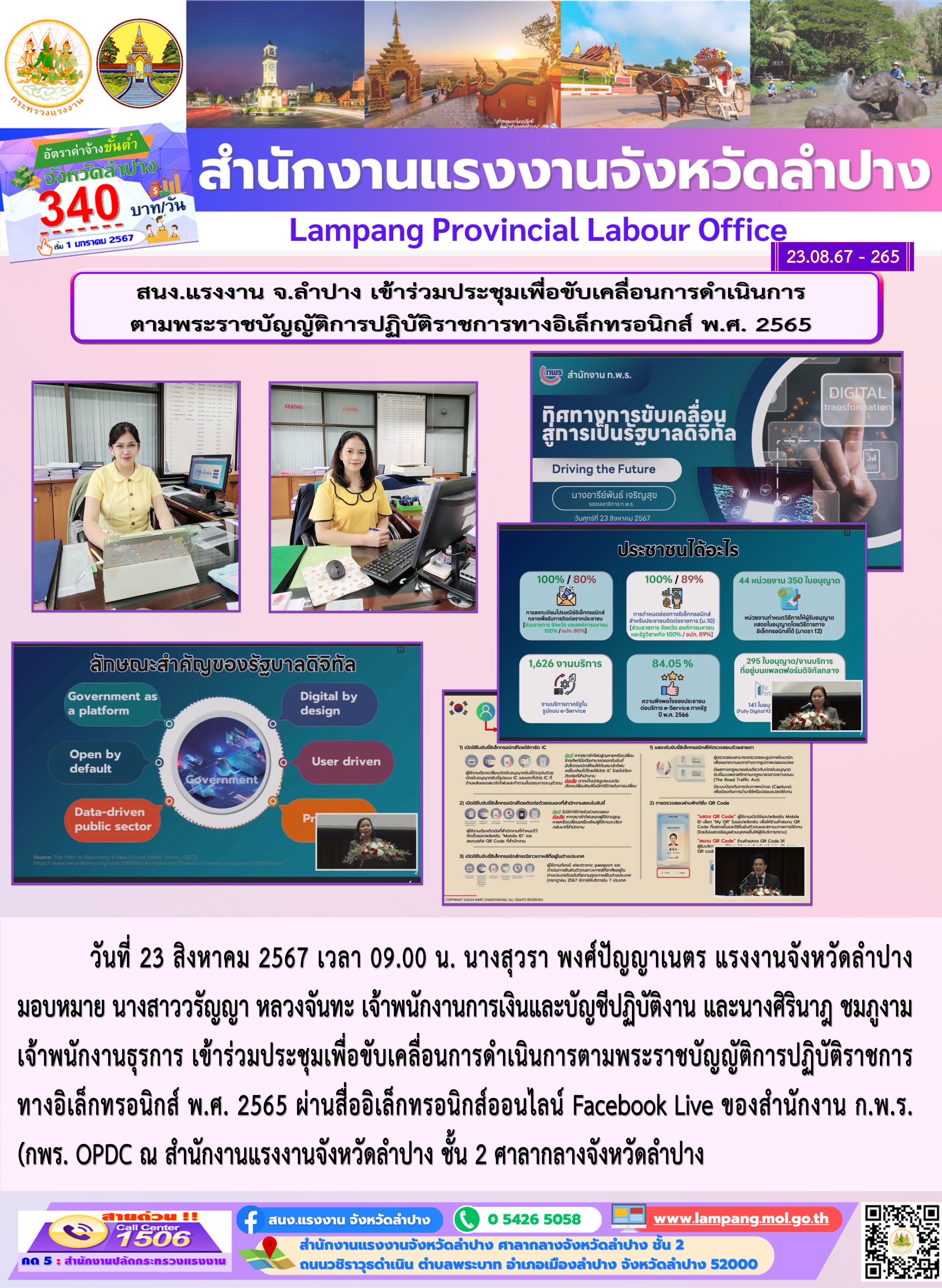 วันที่ 23 สิงหาคม 2567 เวลา 09.00 น. นางสุวรา พงศ์ปัญญาเนตร แรงงานจังหวัดลำปาง มอบหมาย นางสาววรัญญา หลวงจันทะ เจ้าพนักงานการเงินและบัญชีปฏิบัติงาน และนางศิรินาฎ ชมภูงาม เจ้าพนักงานธุรการ เข้าร่วมประชุมเพื่อขับเคลื่อนการดำเนินการตามพระราชบัญญัติการปฏิบัติราชการทางอิเล็กทรอนิกส์ พ.ศ. 2565 ผ่านสื่ออิเล็กทรอนิกส์ออนไลน์ Facebook Live ของสำนักงาน ก.พ.ร. (กพร. OPDC) ณ สำนักงานแรงงานจังหวัดลำปาง ชั้น 2 ศาลากลางจังหวัดลำปาง