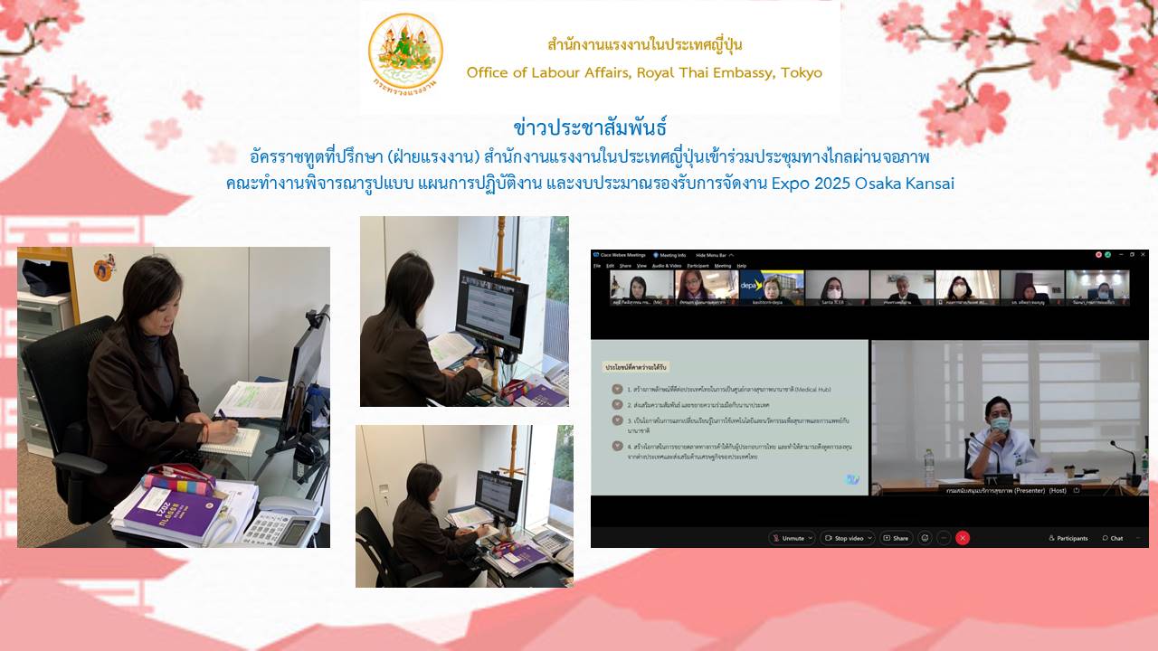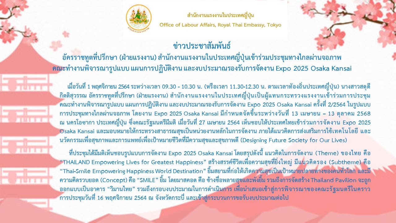 เมื่อวันที่ 1 พฤศจิกายน 2564 ระหว่างเวลา 09.30 – 10.30 น. (หรือเวลา 11.30-12.30 น. ตามเวลาท้องถิ่นประเทศญี่ปุ่น) นางสาวสดุดี กิตติสุวรรณ อัครราชทูตที่ปรึกษา (ฝ่ายแรงงาน) สำนักงานแรงงานในประเทศญี่ปุ่น เป็นผู้แทนกระทรวงแรงงานเข้าร่วมการประชุมคณะทำงานพิจารณารูปแบบ แผนการปฏิบัติงาน และงบประมาณรองรับการจัดงาน Expo 2025 Osaka Kansai ครั้งที่ 2/2564 ในรูปแบบการประชุมทางไกลผ่านจอภาพ โดยงาน Expo 2025 Osaka Kansai มีกำหนดจัดขึ้นระหว่างวันที่ 13 เมษายน – 13 ตุลาคม 2568 ณ นครโอซากา ประเทศญี่ปุ่น ซึ่งคณะรัฐมนตรีมีมติ เมื่อวันที่ 27 เมษายน 2564 เห็นชอบให้ประเทศไทยเข้าร่วมการจัดงาน Expo 2025 Osaka Kansai และมอบหมายให้กระทรวงสาธารณสุขเป็นหน่วยงานหลักในการจัดงาน ภายใต้แนวคิดการส่งเสริมการใช้เทคโนโลยี และนวัตกรรมเพื่อสุขภาพและการแพทย์เพื่อเป้าหมายชีวิตที่มีความสุขและสุขภาพดี (Designing Future Society for Our Lives)