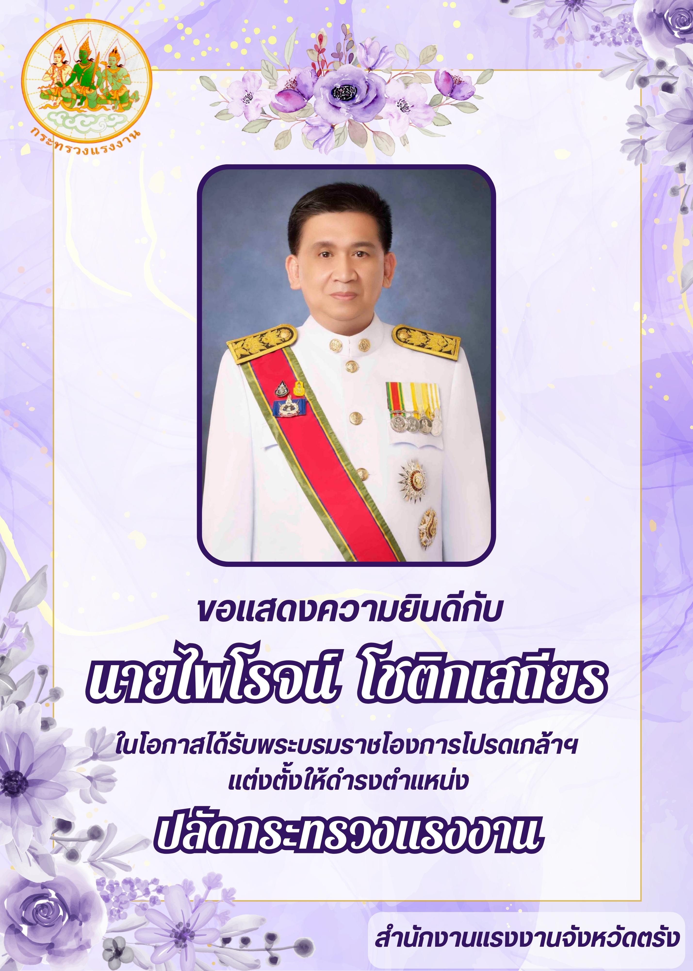สรจ.ตรัง ขอแสดงความยินดีกับ “นายไพโรจน์ โชติกเสถียร” ในโอกาสได้รับพระบรมราชโองการโปรดเกล้าฯ แต่งตั้งให้ดำรงตำแหน่ง “ปลัดกระทรวงแรงงาน”