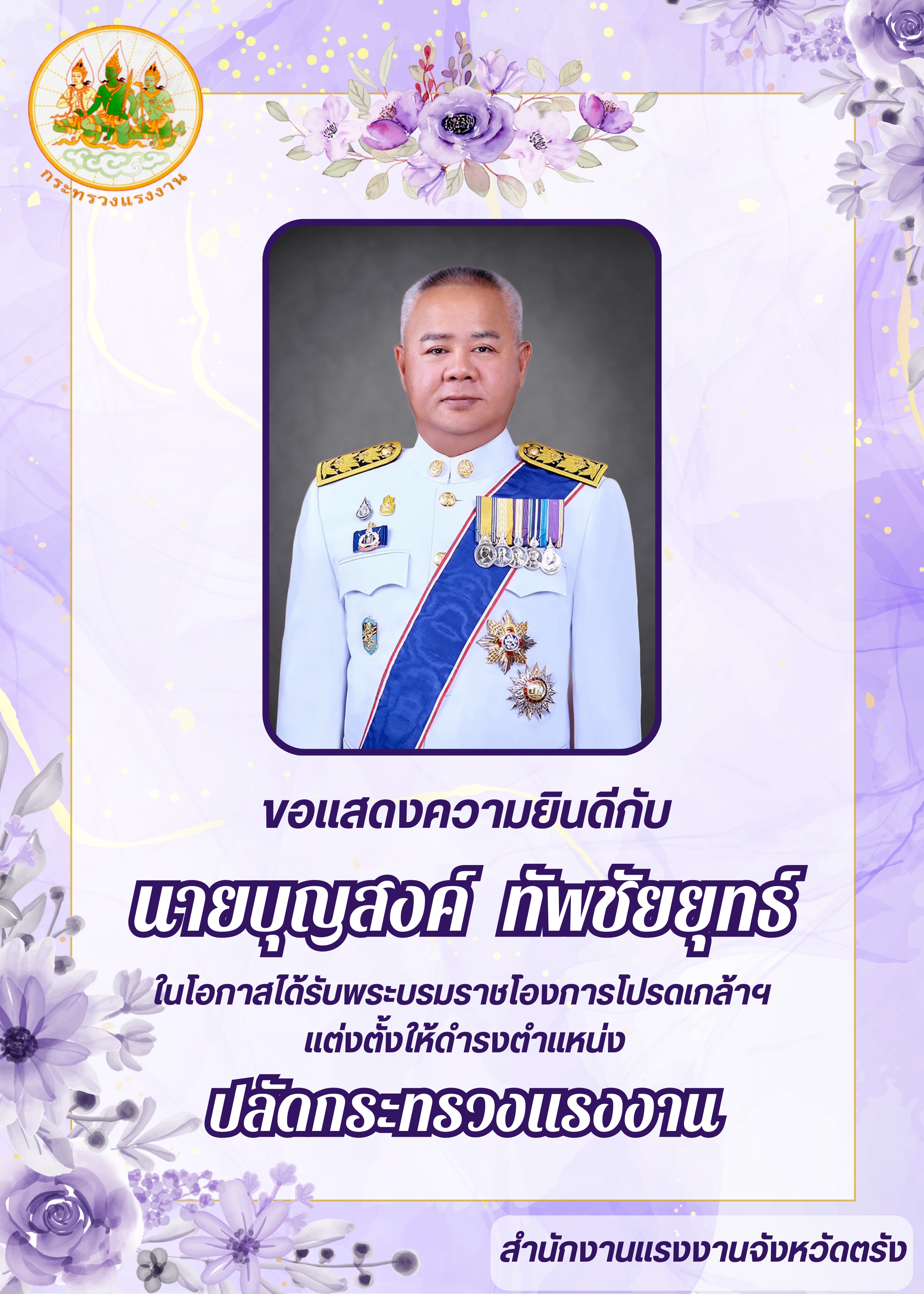 สรจ.ตรัง ขอแสดงความยินดีกับ “นายบุญสงค์ ทัพชัยยุทธ์” ในโอกาสได้รับพระบรมราชโองการโปรดเกล้าฯ แต่งตั้งให้ดำรงตำแหน่ง “ปลัดกระทรวงแรงงาน”