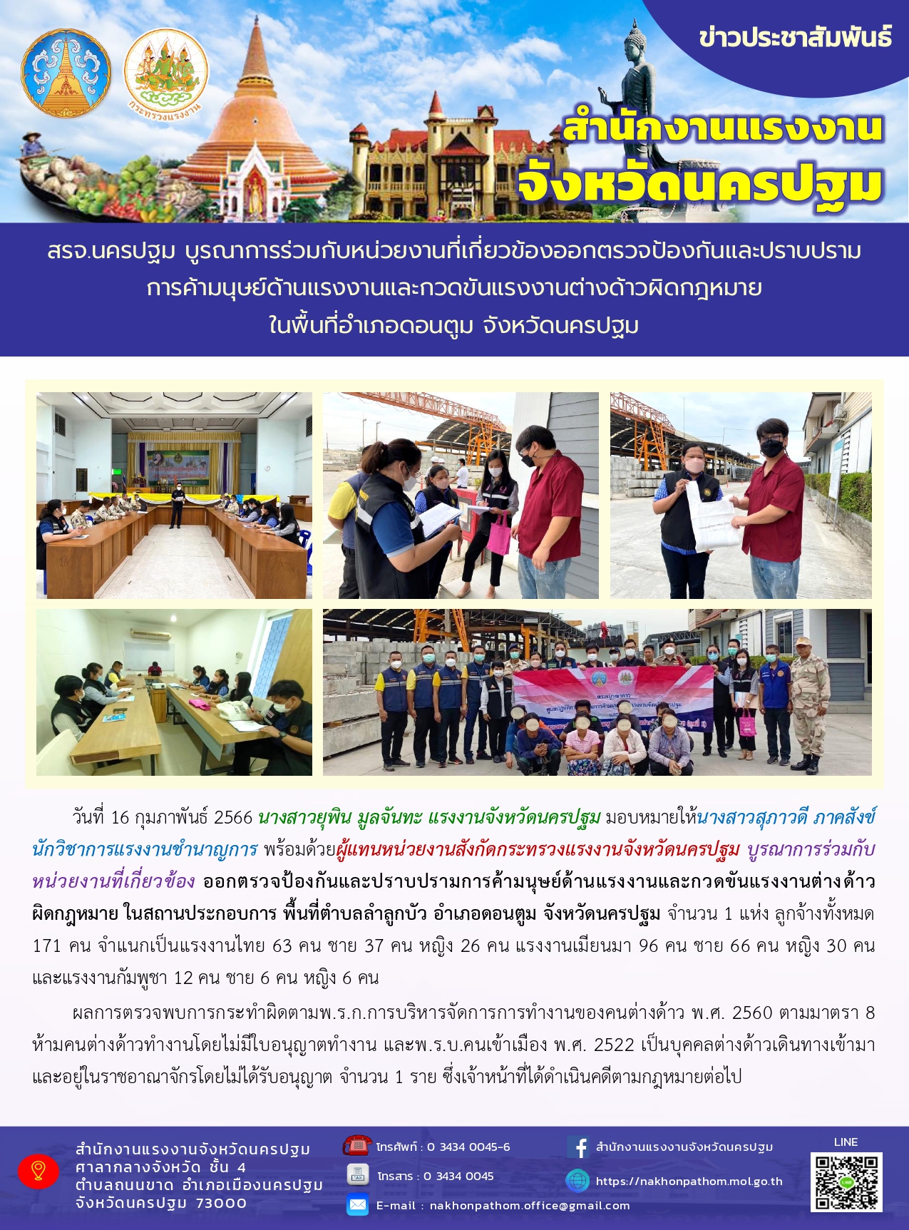 สรจ.นครปฐม บูรณาการร่วมกับหน่วยงานที่เกี่ยวข้องออกตรวจป้องกันและปราบปรามการค้ามนุษย์ด้านแรงงานและกวดขันแรงงานต่างด้าวผิดกฎหมาย ในพื้นที่อำเภอดอนตูม จังหวัดนครปฐม