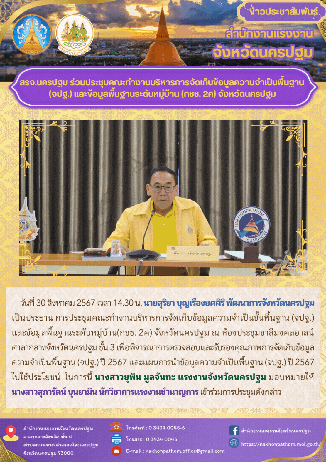 สรจ.นครปฐม ร่วมประชุมคณะทำงานบริหารการจัดเก็บข้อมูลความจำเป็นพื้นฐาน (จปฐ.) และข้อมูลพื้นฐานระดับหมู่บ้าน (กชช. 2ค) จังหวัดนครปฐม