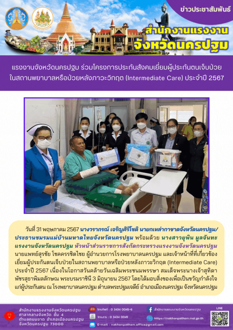 สรจ.นครปฐม ร่วมโครงการประกันสังคมเยี่ยมผู้ประกันตนเจ็บป่วยในสถานพยาบาลหรือป่วยหลังภาวะวิกฤต (Intermediate Care) ประจำปี 2567