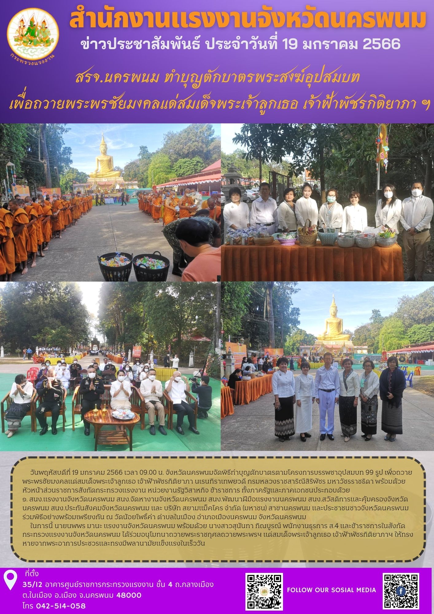 วันพฤหัสบดีที่ 19 มกราคม 2566 เวลา 09.00 น. จังหวัดนครพนมจัดพิธีทำบุญตักบาตรตามโครงการบรรพชาอุปสมบท 99 รูป เพื่อถวายพระพรชัยมงคลแด่สมเด็จพระเจ้าลูกเธอ เจ้าฟ้าพัชรกิติยาภา นเรนทิราเทพยวดี กรมหลวงราชสาริณีสิริพัชร มหาวัชรราชธิดา พร้อมด้วยหัวหน้าส่วนราชการสังกัดกระทรวงแรงงาน หน่วยงานรัฐวิสาหกิจ ข้าราชการ ทั้งภาครัฐและภาคเอกชนประกอบด้วย