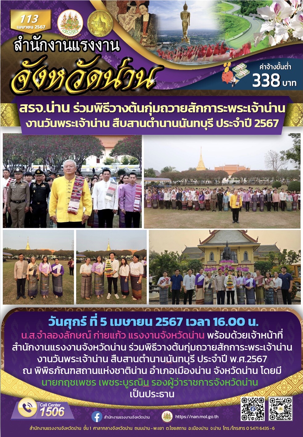 น.ส.จำลองลักษณ์ ก่ายแก้ว แรงงานจังหวัดน่าน พร้อมด้วยเจ้าหน้าที่สำนักงานแรงงานจังหวัดน่าน ร่วมพิธีวางต้นกุ่มถวายสักการะพระเจ้าน่านงานวันพระเจ้าน่าน สืบสานตำนานนันทบุรี ประจำปี พ.ศ.2567 ณ พิพิธภัณฑสถานแห่งชาติน่าน อำเภอเมืองน่าน จังหวัดน่าน โดยนายกฤชเพชร เพชระบูรณิน รองผู้ว่าราชการจังหวัดน่าน เป็นประธาน