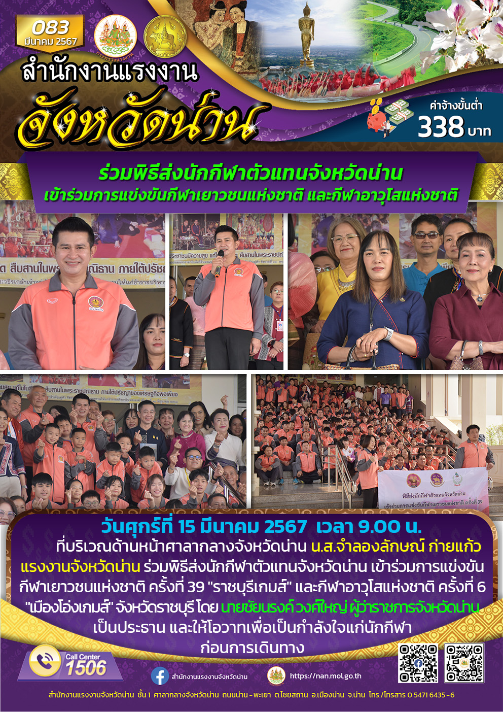 ที่บริเวณด้านหน้าศาลากลางจังหวัดน่าน น.ส.จำลองลักษณ์ ก่ายแก้ว แรงงานจังหวัดน่าน ร่วมพิธีส่งนักกีฬาตัวแทนจังหวัดน่าน เข้าร่วมการแข่งขันกีฬาเยาวชนแห่งชาติ ครั้งที่ 39 “ราชบุรีเกมส์” และกีฬาอาวุโสแห่งชาติ ครั้งที่ 6 “เมืองโอ่งเกมส์” จังหวัดราชบุรี โดย นายชัยนรงค์ วงศ์ใหญ่ ผู้ว่าราชการจังหวัดน่าน เป็นประธาน และให้โอวาทเพื่อเป็นกำลังใจแก่นักกีฬาก่อนการเดินทาง