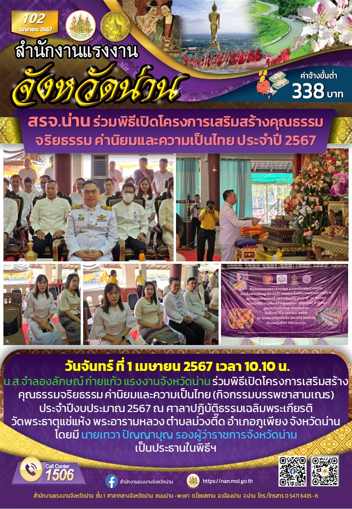 น.ส.จำลองลักษณ์ ก่ายแก้ว แรงงานจังหวัดน่าน ร่วมพิธีเปิดโครงการเสริมสร้างคุณธรรมจริยธรรม ค่านิยมและความเป็นไทย (กิจกรรมบรรพชาสามเณร) ประจำปีงบประมาณ 2567 ณ ศาลาปฏิบัติธรรมเฉลิมพระเกียรติ วัดพระธาตุแช่แห้ง พระอารามหลวง ตำบลม่วงตึ๊ด อำเภอภูเพียง จังหวัดน่าน โดยมี นายเทวา ปัญญาบุญ รองผู้ว่าราชการจังหวัดน่าน เป็นประธานในพิธีฯ