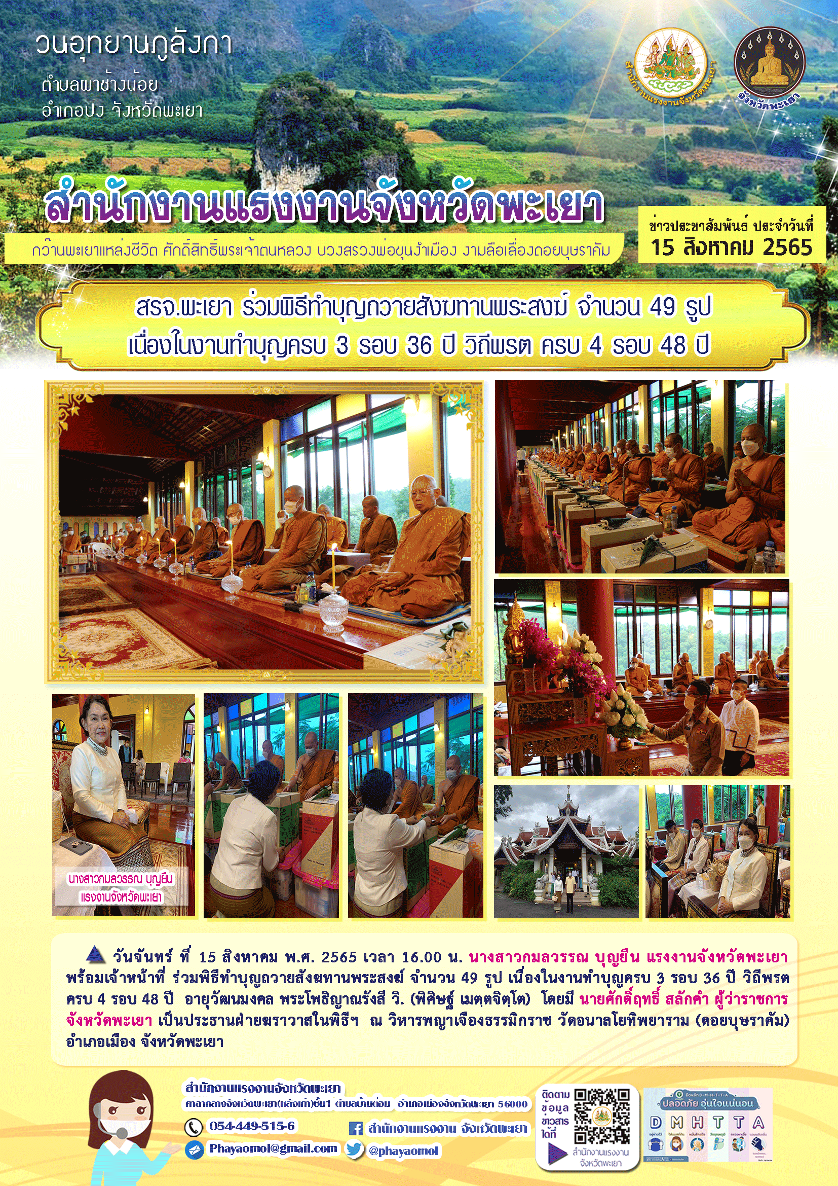 วันจันทร์ที่ 15 สิงหาคม 2565 เวลา 16.00 น. นางสาวกมลวรรณ บุญยืน แรงงานจังหวัดพะเยา พร้อมเจ้าหน้าที่ ร่วมพิธีทำบุญถวายสังฆทานพระสงฆ์ จำนวน 49 รูป เนื่องในงานทำบุญครบ 3 รอบ 36 ปี วิถีพรต ครบ 4 รอบ 48 ปี อายุวัฒนมงคล พระโพธิญาณรังสี วิ. (พิศิษฐ์ เมตฺตจิตฺโต) โดยมี นายศักดิ์ฤทธิ์ สลักคำ ผู้ว่าราชการจังหวัดพะเยา เป็นประธานฝ่ายฆราวาสในพิธีฯ