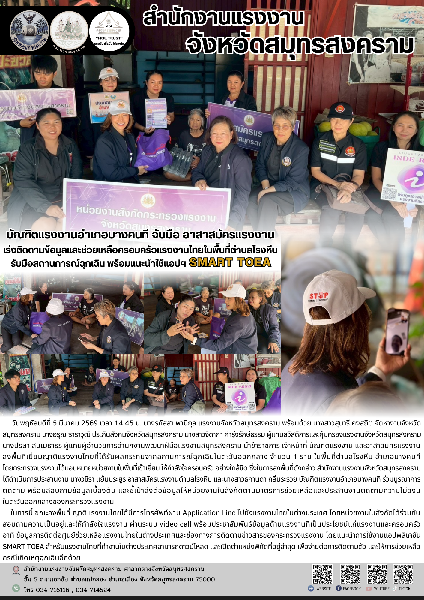 บัณฑิตแรงงานอำเภอบางคนที จับมือ อาสาสมัครแรงงาน เร่งติดตามข้อมูลและช่วยเหลือครอบครัวแรงงานไทยในพื้นที่ตำบลโรงหีบ รับมือสถานการณ์ฉุกเฉิน พร้อมแนะนำใช้แอปฯ SMART TOEA