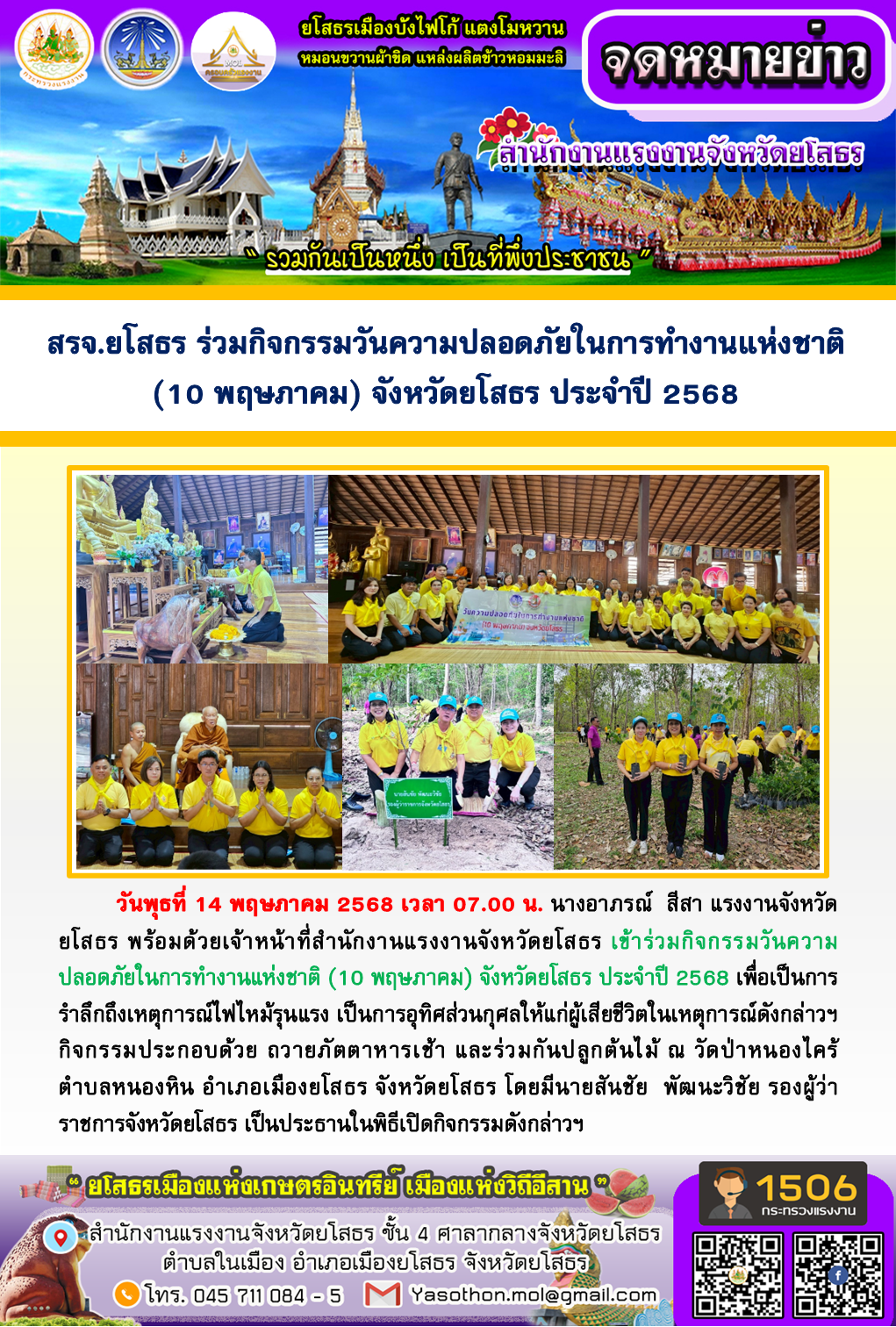 สรจ.ยโสธร ร่วมกิจกรรมวันความปลอดภัยในการทำงานแห่งชาติ (10 พฤษภาคม) จังหวัดยโสธร ประจำปี 2568