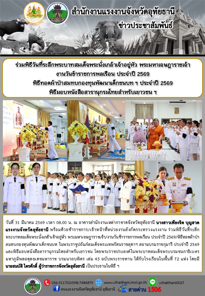 ร่วมพิธีวันที่ระลึกพระบาทสมเด็จพระนั่งเกล้าเจ้าอยู่หัว พระมหาเจษฎาราชเจ้า งานวันข้าราชการพลเรือน ประจำปี 2569 พิธีทอดผ้าป่าสมทบกองทุนพัฒนาเด็กชนบท ฯ ประจำปี 2569 พิธีมอบหนังสือสารานุกรมไทยสำหรับเยาวชน ฯ