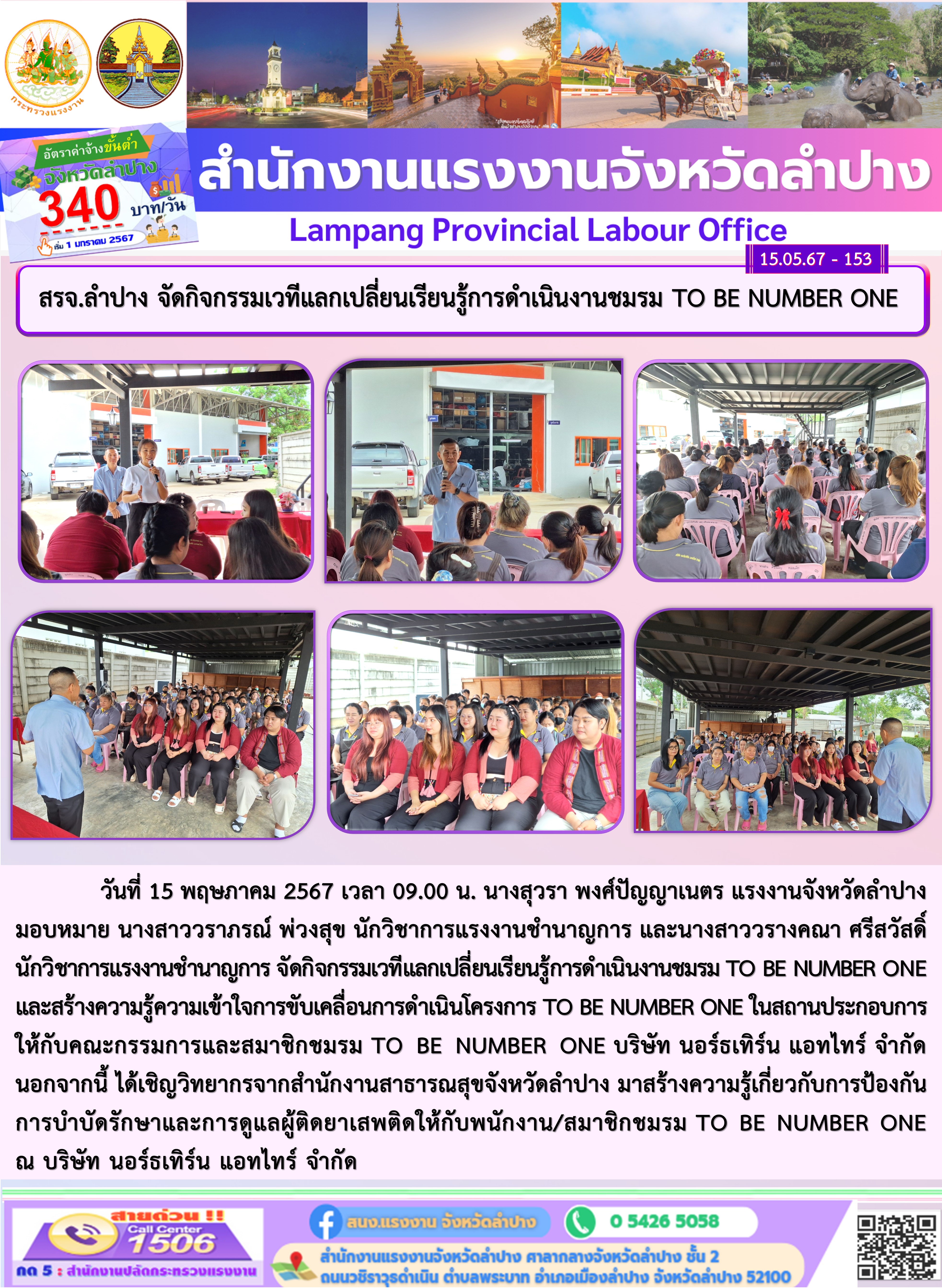 วันที่ 15 พฤษภาคม 2567 เวลา 09.00 น. นางสุวรา พงศ์ปัญญาเนตร แรงงานจังหวัดลำปาง มอบหมาย นางสาววราภรณ์ พ่วงสุข นักวิชาการแรงงานชำนาญการ และนางสาววรางคณา ศรีสวัสดิ์ นักวิชาการแรงงานชำนาญการ จัดกิจกรรมเวทีแลกเปลี่ยนเรียนรู้การดำเนินงานชมรม TO BE NUMBER ONE และสร้างความรู้ความเข้าใจการขับเคลื่อนการดำเนินโครงการ TO BE NUMBER ONE ในสถานประกอบการให้กับคณะกรรมการและสมาชิกชมรม TO BE NUMBER ONE บริษัท นอร์ธเทิร์น แอทไทร์ จำกัด นอกจากนี้ ได้เชิญวิทยากรจากสำนักงานสาธารณสุขจังหวัดลำปาง มาสร้างความรู้เกี่ยวกับการป้องกัน การบำบัดรักษาและการดูแลผู้ติดยาเสพติดให้กับพนักงาน/สมาชิกชมรม TO BE NUMBER ONE ณ บริษัท นอร์ธเทิร์น แอทไทร์ จำกัด
