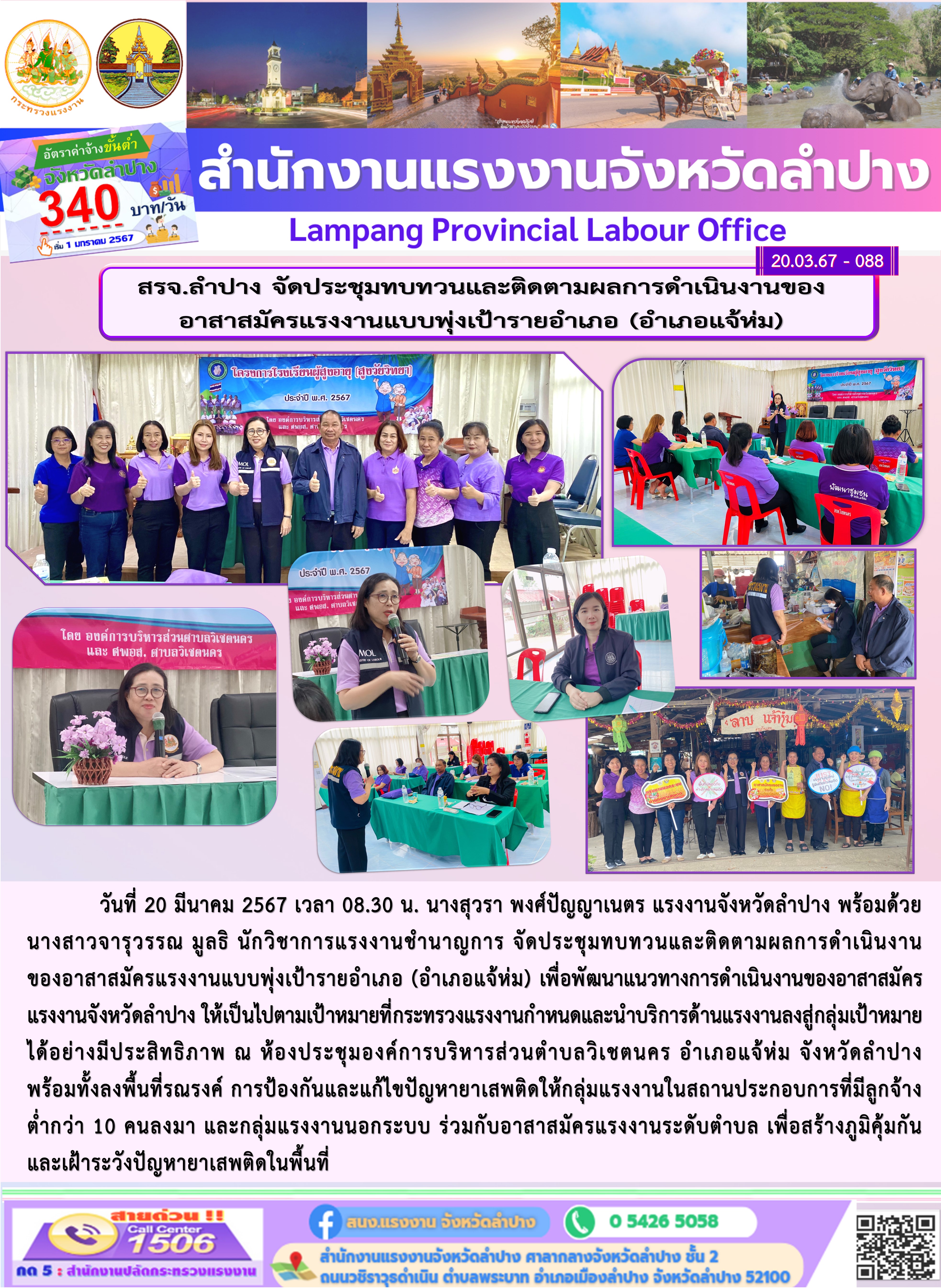 วันที่ 20 มีนาคม 2567 เวลา 08.30 น. นางสุวรา พงศ์ปัญญาเนตร แรงงานจังหวัดลำปาง พร้อมด้วย นางสาวจารุวรรณ มูลธิ นักวิชาการแรงงานชำนาญการ จัดประชุมทบทวนและติดตามผลการดำเนินงานของอาสาสมัครแรงงานแบบพุ่งเป้ารายอำเภอ (อำเภอแจ้ห่ม) เพื่อพัฒนาแนวทางการดำเนินงานของอาสาสมัครแรงงานจังหวัดลำปาง ให้เป็นไปตามเป้าหมายที่กระทรวงแรงงานกำหนดและนำบริการด้านแรงงานลงสู่กลุ่มเป้าหมาย ได้อย่างมีประสิทธิภาพ ณ ห้องประชุมองค์การบริหารส่วนตำบลวิเชตนคร อำเภอแจ้ห่ม จังหวัดลำปาง พร้อมทั้งลงพื้นที่รณรงค์ การป้องกันและแก้ไขปัญหายาเสพติดให้กลุ่มแรงงานในสถานประกอบการที่มีลูกจ้างต่ำกว่า 10 คนลงมา และกลุ่มแรงงานนอกระบบ ร่วมกับอาสาสมัครแรงงานระดับตำบล เพื่อสร้างภูมิคุ้มกันและเฝ้าระวังปัญหายาเสพติดในพื้นที่
