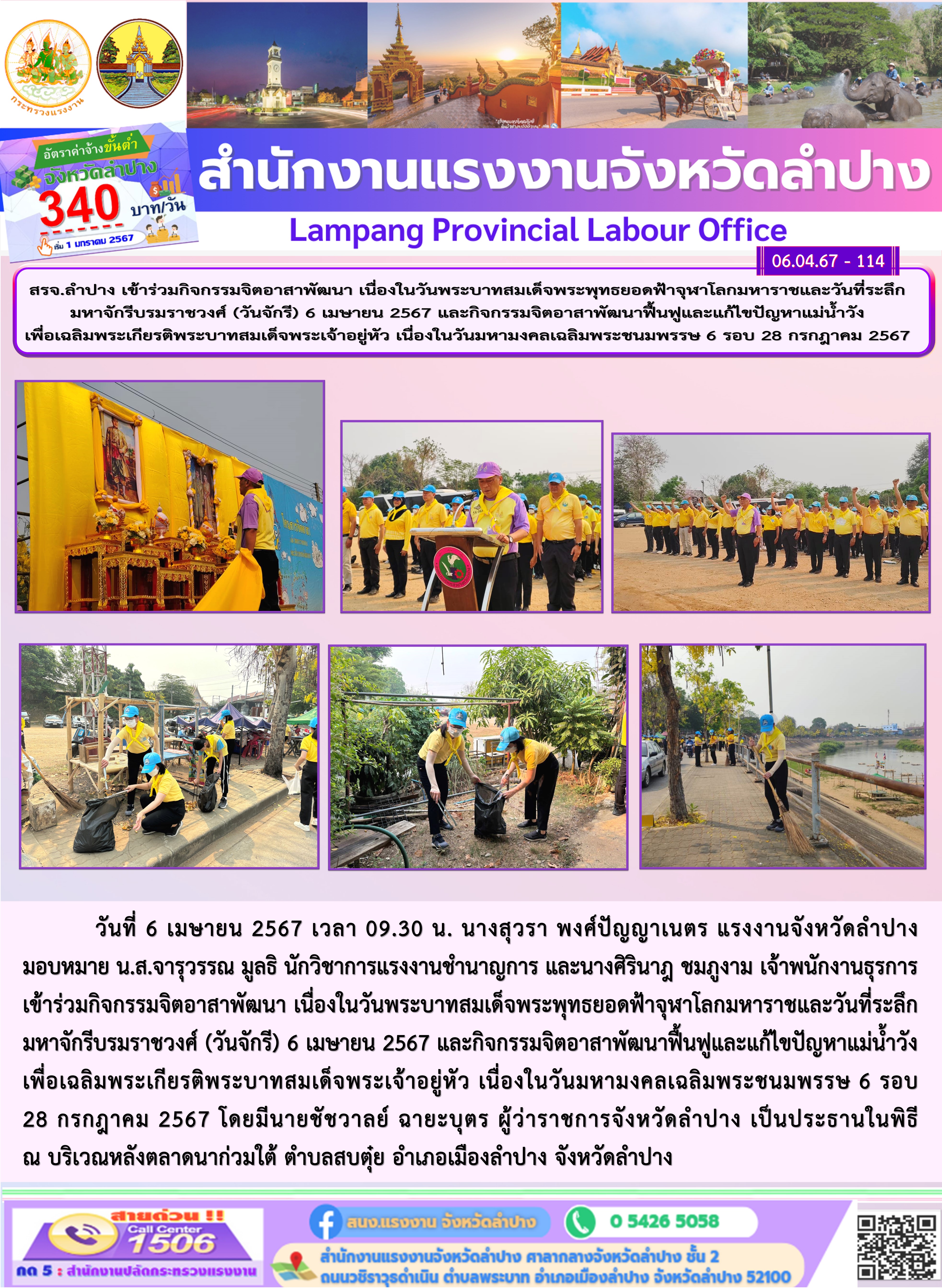 วันที่ 6 เมษายน 2567 เวลา 09.30 น. นางสุวรา พงศ์ปัญญาเนตร แรงงานจังหวัดลำปาง มอบหมาย น.ส.จารุวรรณ มูลธิ นักวิชาการแรงงานชำนาญการ และนางศิรินาฎ ชมภูงาม เจ้าพนักงานธุรการ เข้าร่วมกิจกรรมจิตอาสาพัฒนา เนื่องในวันพระบาทสมเด็จพระพุทธยอดฟ้าจุฬาโลกมหาราชและวันที่ระลึกมหาจักรีบรมราชวงศ์ (วันจักรี) 6 เมษายน 2567 และกิจกรรมจิตอาสาพัฒนาฟื้นฟูและแก้ไขปัญหาแม่น้ำวัง เพื่อเฉลิมพระเกียรติพระบาทสมเด็จพระเจ้าอยู่หัว เนื่องในวันมหามงคลเฉลิมพระชนมพรรษ 6 รอบ 28 กรกฎาคม 2567 โดยมีนายชัชวาลย์ ฉายะบุตร ผู้ว่าราชการจังหวัดลำปาง เป็นประธานในพิธี ณ บริเวณหลังตลาดนาก่วมใต้ ตำบลสบตุ๋ย อำเภอเมืองลำปาง จังหวัดลำปาง