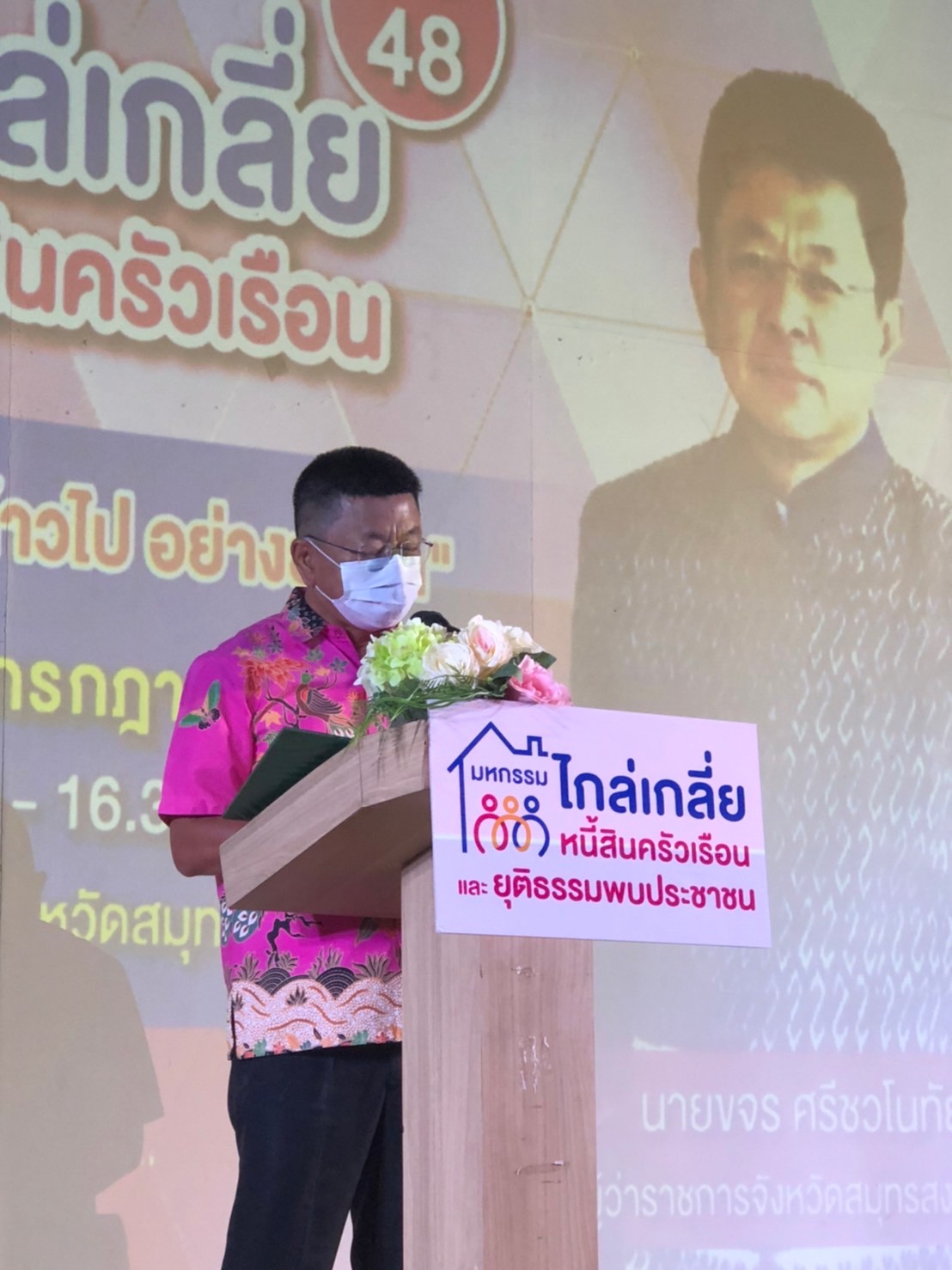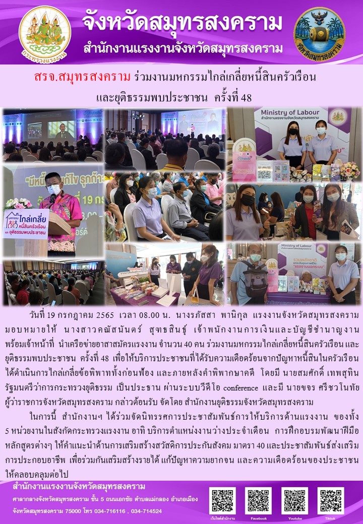 วันที่ 19 กรกฎาคม 2565 เวลา 08.00 น. นางรภัสสา พานิกุล แรงงานจังหวัดสมุทรสงคราม มอบหมายให้ นางสาวคณัสนันตร์ สุฑธสินธุ์ เจ้าพนักงานการเงินและบัญชีชำนาญงาน พร้อมเจ้าหน้าที่ นำเครือข่ายอาสาสมัครแรงงาน จำนวน 40 คน ร่วมงานมหกรรมไกล่เกลี่ยหนี้สินครัวเรือน และยุติธรรมพบประชาชน ครั้งที่ 48 เพื่อให้บริการประชาชนที่ได้รับความเดือดร้อนจากปัญหาหนี้สินในครัวเรือน ได้ดำเนินการไกล่เกลี่ยข้อพิพาททั้งก่อนฟ้อง และภายหลังคำพิพากษาคดี โดยมี นายสมศักดิ์ เทพสุทิน รัฐมนตรีว่าการกระทรวงยุติธรรม เป็นประธาน ผ่านระบบวีดีโอ conference และมี นายขจร ศรีชวโนทัย ผู้ว่าราชการจังหวัดสมุทรสงคราม กล่าวต้อนรับ จัดโดย สำนักงานยุติธรรมจังหวัดสมุทรสงคราม
