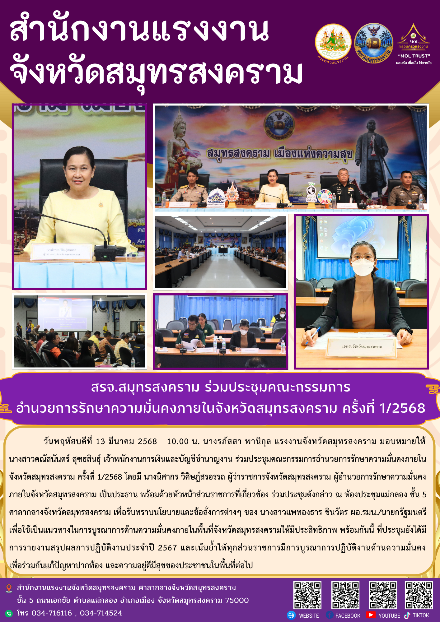 วันพฤหัสบดีที่ 13 มีนาคม 2568 เวลา 10.00 น. นางรภัสสา พานิกุล แรงงานจังหวัดสมุทรสงคราม มอบหมายให้ นางสาวคณัสนันตร์ สุฑธสินธุ์ เจ้าพนักงานการเงินและบัญชีชำนาญงาน ร่วมประชุมคณะกรรมการอำนวยการรักษาความมั่นคงภายในจังหวัดสมุทรสงคราม ครั้งที่ 1/2568 โดยมี นางนิศากร วิศิษฎ์สรอรรถ ผู้ว่าราชการจังหวัดสมุทรสงคราม ผู้อำนวยการรักษาความมั่นคงภายในจังหวัดสมุทรสงคราม เป็นประธาน พร้อมด้วยหัวหน้าส่วนราชการที่เกี่ยวข้อง ร่วมประชุมดังกล่าว ณ ห้องประชุมแม่กลอง ชั้น 5 ศาลากลางจังหวัดสมุทรสงคราม เพื่อรับทราบนโยบายและข้อสั่งการต่างๆ ของ นางสาวแพทองธาร ชินวัตร ผอ.รมน./นายกรัฐมนตรี เพื่อใช้เป็นแนวทางในการบูรณาการด้านความมั่นคงภายในพื้นที่จังหวัดสมุทรสงครามให้มีประสิทธิภาพ พร้อมกันนี้ ที่ประชุมยังได้มีการรายงานสรุปผลการปฏิบัติงานประจำปี 2567 และเน้นย้ำให้ทุกส่วนราชการมีการบูรณาการปฏิบัติงานด้านความมั่นคง เพื่อร่วมกันแก้ปัญหาปากท้อง และความอยู่ดีมีสุขของประชาชนในพื้นที่ต่อไป
