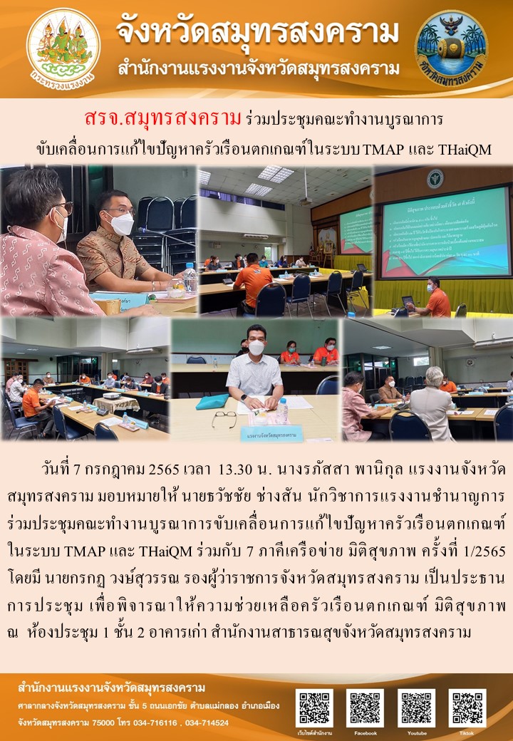 วันที่ 7 กรกฎาคม 2565 เวลา 13.30 น. นางรภัสสา พานิกุล แรงงานจังหวัดสมุทรสงคราม มอบหมายให้ นายธวัชชัย ช่างสัน นักวิชาการแรงงานชำนาญการ ร่วมประชุมคณะทำงานบูรณาการขับเคลื่อนการแก้ไขปัญหาครัวเรือนตกเกณฑ์ในระบบ TMAP และ THaiQM ร่วมกับ 7 ภาคีเครือข่าย มิติสุขภาพ ครั้งที่ 1/2565 โดยมี นายกรกฏ วงษ์สุวรรณ รองผู้ว่าราชการจังหวัดสมุทรสงคราม เป็นประธานการประชุม เพื่อพิจารณาให้ความช่วยเหลือครัวเรือนตกเกณฑ์ มิติสุขภาพ ณ ห้องประชุม 1 ชั้น 2 อาคารเก่า สำนักงานสาธารณสุขจังหวัดสมุทรสงคราม