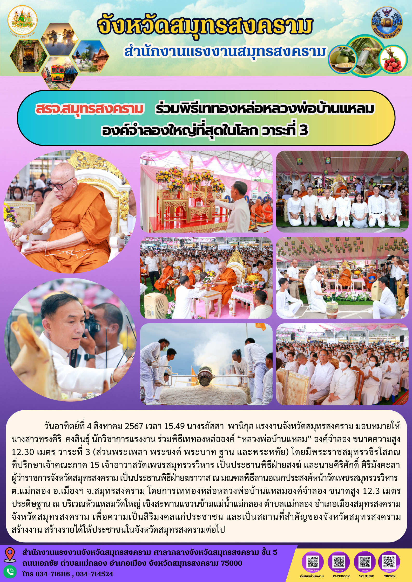 วันอาทิตย์ที่ 4 สิงหาคม 2567 เวลา 15.49 นางรภัสสา พานิกุล แรงงานจังหวัดสมุทรสงคราม มอบหมายให้นางสาวทรงศิริ คงสินธุ์ นักวิชาการแรงงาน ร่วมพิธีเททองหล่อองค์ “หลวงพ่อบ้านแหลม” องค์จำลอง ขนาดความสูง 12.30 เมตร วาระที่ 3 (ส่วนพระเพลา พระชงค์ พระบาท ฐาน และพระหทัย) โดยมีพระราชสมุทรวชิรโสภณ ที่ปรึกษาเจ้าคณะภาค 15 เจ้าอาวาสวัดเพชรสมุทรวรวิหาร เป็นประธานพิธีฝ่ายสงฆ์ และนายศิริศักดิ์ ศิริมังคะลา ผู้ว่าราชการจังหวัดสมุทรสงคราม เป็นประธานพิธีฝ่ายฆราวาส ณ มณฑลพิธีลานอเนกประสงค์หน้าวัดเพชรสมุทรวรวิหาร ต.แม่กลอง อ.เมืองฯ จ.สมุทรสงคราม โดยการเททองหล่อหลวงพ่อบ้านแหลมองค์จำลอง ขนาดสูง 12.3 เมตร ประดิษฐาน ณ บริเวณหัวแหลมวัดใหญ่ เชิงสะพานแขวนข้ามแม่น้ำแม่กลอง ตำบลแม่กลอง อำเภอเมืองสมุทรสงคราม จังหวัดสมุทรสงคราม เพื่อความเป็นสิริมงคลแก่ประชาชน และเป็นสถานที่สำคัญของจังหวัดสมุทรสงคราม สร้างงาน สร้างรายได้ให้ประชาชนในจังหวัดสมุทรสงครามต่อไป