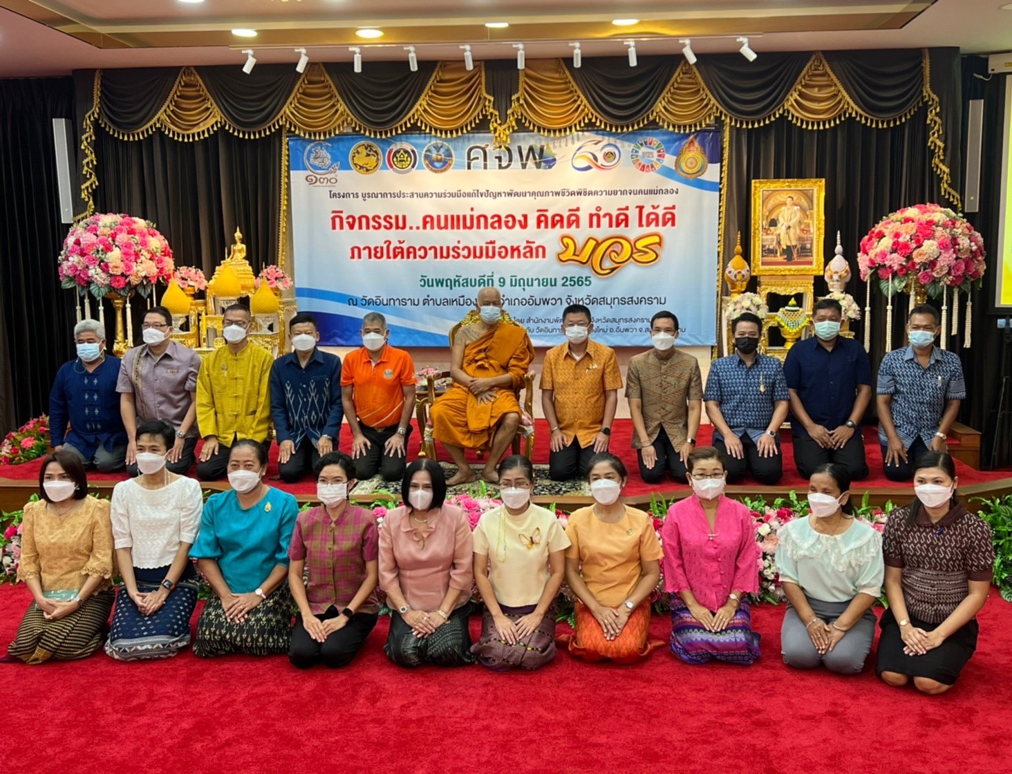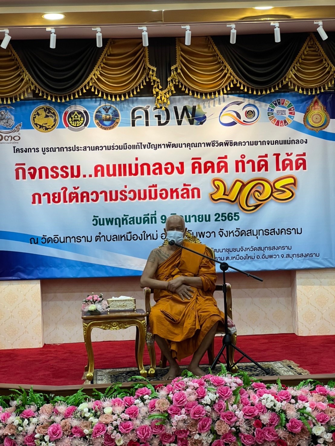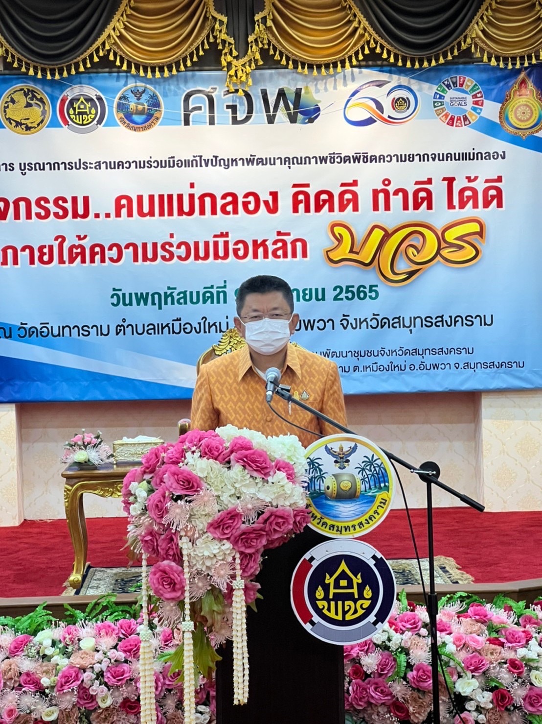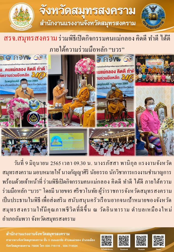 วันที่ 9 มิถุนายน 2565 เวลา 09.30 น. นางรภัสสา พานิกุล แรงงานจังหวัดสมุทรสงคราม มอบหมายให้ นางกัญญาศิริ นัยอรรถ นักวิชาการแรงงานชำนาญการ พร้อมด้วยเจ้าหน้าที่ ร่วมพิธีเปิดกิจกรรมคนแม่กลอง คิดดี ทำดี ได้ดี ภายใต้ความร่วมมือหลัก “บวร” โดยมี นายขจร ศรีชวโนทัย ผู้ว่าราชการจังหวัดสมุทรสงคราม เป็นประธานในพิธี เพื่อส่งเสริม สนับสนุนครัวเรือนยากจนเป้าหมายของจังหวัดสมุทรสงครามให้มีคุณภาพชีวิตที่ดีขึ้น ณ วัดอินทาราม ตำบลเหมืองใหม่ อำเภออัมพวา จังหวัดสมุทรสงคราม