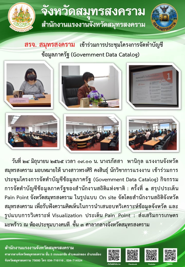 วันที่ 24 มิถุนายน 2565 เวลา 09.00 น. นางรภัสสา  พานิกุล แรงงานจังหวัดสมุทรสงคราม มอบหมายให้ นางสาวทรงศิริ คงสินธุ์ นักวิชาการแรงงาน เข้าร่วมการประชุมโครงการจัดทำบัญชีข้อมูลภาครัฐ (Govemment Data Catalog) กิจกรรมการจัดทำบัญชีข้อมูลภาครัฐของสำนักงานสถิติแห่งชาติ : ครั้งที่ 1 สรุปประเด็น Pain Point จังหวัดสมุทรสงคราม ในรูปแบบ On site จัดโดยสำนักงานสถิติจังหวัดสมุทรสงคราม เพื่อรับฟังความคิดเห็นในการนำเสนอบทวิเคราะห์ข้อมูลจังหวัด และรูปแบบการวิเคราะห์ Visualization ประเด็น Pain Point : ส่งเสริมการเกษตรมะพร้าว ณ ห้องประชุมบางคนที ชั้น 3 ศาลากลางจังหวัดสมุทรสงคราม