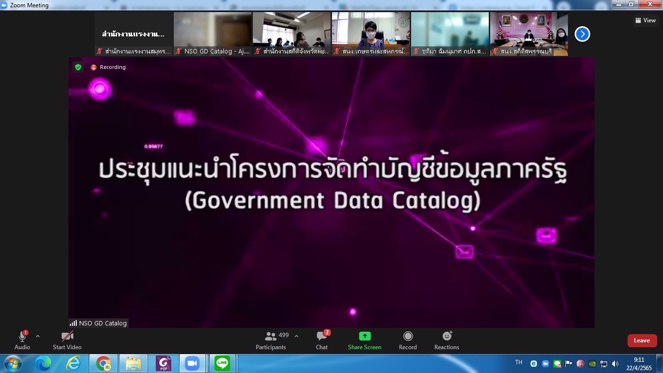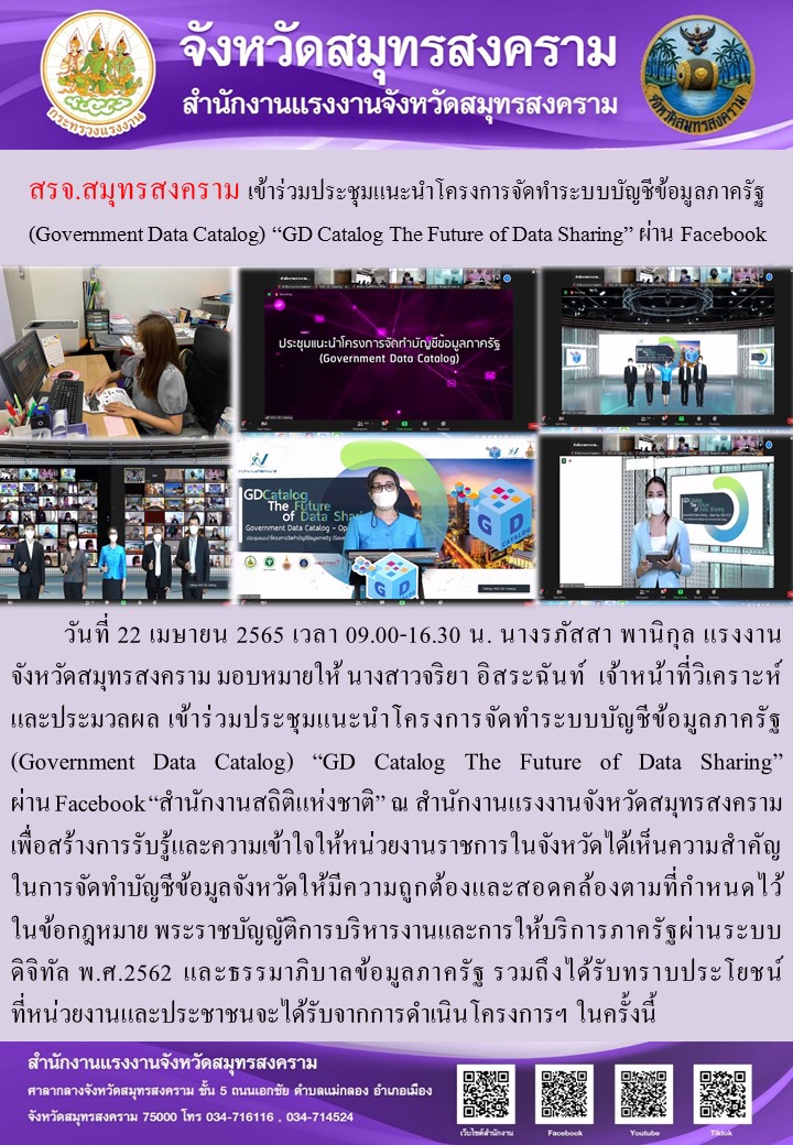 วันที่ 22 เมษายน 2565 เวลา 09.00-16.30 น. นางรภัสสา พานิกุล แรงงานจังหวัดสมุทรสงคราม มอบหมายให้ นางสาวจริยา อิสระฉันท์ เจ้าหน้าที่วิเคราะห์และประมวลผล เข้าร่วมประชุมแนะนำโครงการจัดทำระบบบัญชีข้อมูลภาครัฐ (Government Data Catalog) “GD Catalog The Future of Data Sharing” ผ่าน Facebook “สำนักงานสถิติแห่งชาติ” ณ สำนักงานแรงงานจังหวัดสมุทรสงคราม เพื่อสร้างการรับรู้และความเข้าใจให้หน่วยงานราชการในจังหวัดได้เห็นความสำคัญในการจัดทำบัญชีข้อมูลจังหวัดให้มีความถูกต้องและสอดคล้องตามที่กำหนดไว้ในข้อกฎหมาย พระราชบัญญัติการบริหารงานและการให้บริการภาครัฐผ่านระบบดิจิทัล พ.ศ.2562 และธรรมาภิบาลข้อมูลภาครัฐ รวมถึงได้รับทราบประโยชน์ที่หน่วยงานและประชาชนจะได้รับจากการดำเนินโครงการฯ ในครั้งนี้