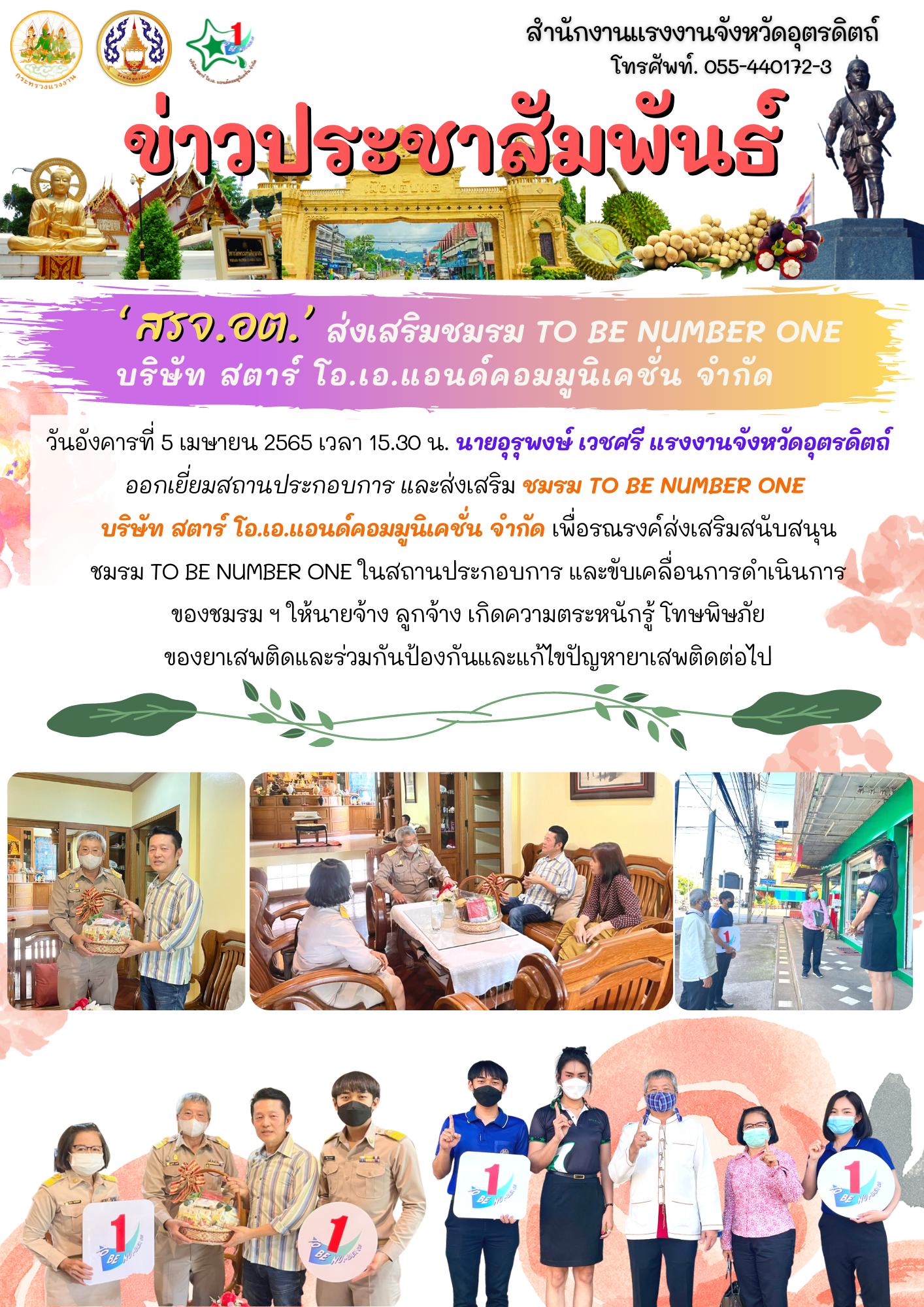 วันอังคารที่ 5 เมษายน 2565 เวลา 15.30 น. นายอุรุพงษ์ เวชศรี แรงงานจังหวัดอุตรดิตถ์ ออกเยี่ยมสถานประกอบการ และส่งเสริม ชมรม TO BE NUMBER ONE บริษัท สตาร์ โอ.เอ.แอนด์คอมมูนิเคชั่น จำกัด เพื่อรณรงค์ส่งเสริมสนับสนุนชมรม TO BE NUMBER ONE ในสถานประกอบการ และขับเคลื่อนการดำเนินการของชมรม ฯ ให้นายจ้าง ลูกจ้าง เกิดความตระหนักรู้ โทษพิษภัยของยาเสพติดและร่วมกันป้องกันและแก้ไขปัญหายาเสพติดต่อไป